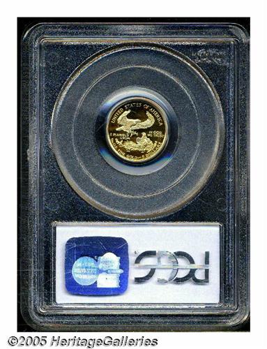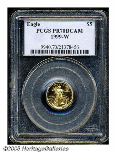<B>1999-W<G$5> Tenth-Ounce Gold Eagle PR70 Deep Cameo PCGS.</B></I> Virtually perfect example of this bullion issue, with sharp contrast and some deeper red color around the peripheries. Population: 3 in 70 (6/05).<BR><I>From The William Bickel Collection, Part One.</B></I>