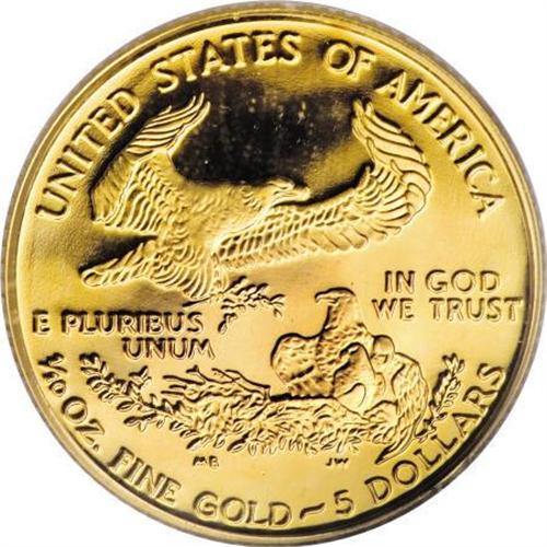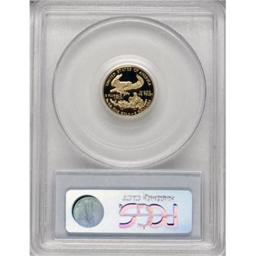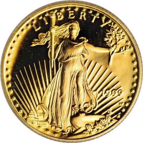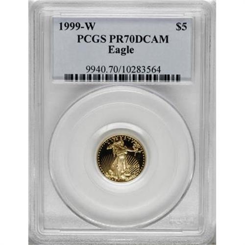 <B>1999-W G$5 Tenth-Ounce Gold Eagle PR70 Deep Cameo PCGS.</B></I> A gold-on-black contrast greets the observer of this Deep Cameo gold eagle, and the sharpness of the design features serves to enhance the outstanding eye appeal. Close examination reveals no post-strike ticks or spots that would negate the numerical grade. Population: 6 in 70 Deep Cameo(11/07).<BR><BR><b>Shipping:</b> Coins & Currency (<a target="_blank" href="http://www.heritageauctions.com/common/shipping.php">view shipping information</a>)