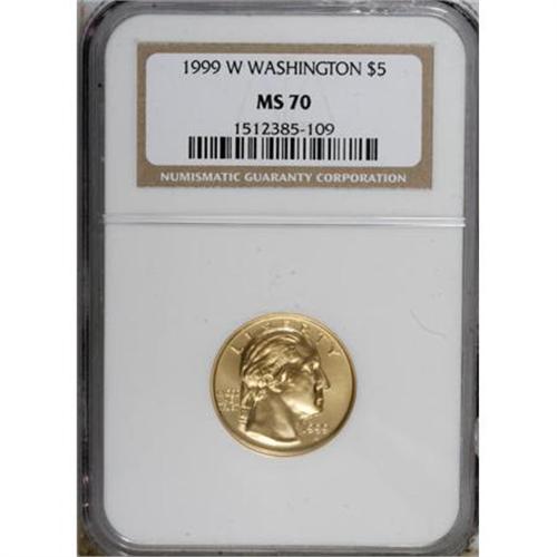 <B>1999-W G$5 Washington Gold Five Dollar MS70 NGC.</B></I> NGC Census: (0/0). PCGS Population (30/0). Numismedia Wsl. Price for NGC/PCGS coin in PR70: $500. (#99777)<BR><BR><b>Shipping:</b> Coins & Currency (<a target="_blank" href="http://www.heritageauctions.com/common/shipping.php">view shipping information</a>)