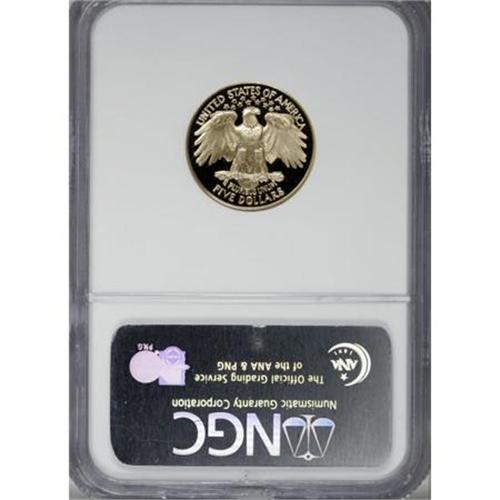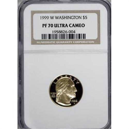 <B>1999-W G$5 Washington Gold Five Dollar PR70 Deep Cameo NGC.</B></I> NGC Census: (482/0). PCGS Population (30/0). Numismedia Wsl. Price for NGC/PCGS coin in PR70: $500. (#99777)<BR><BR><b>Shipping:</b> Coins & Currency (<a target="_blank" href="http://www.heritageauctions.com/common/shipping.php">view shipping information</a>)