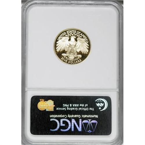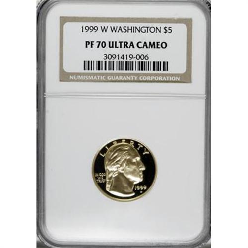<B>1999-W G$5 Washington Gold Five Dollar PR70 Ultra Cameo NGC.</B></I> The motifs appear to float over the deep watery fields. Fully struck, with absolutely no blemishes.<BR><BR><b>Shipping:</b> Coins & Currency (<a target="_blank" href="http://www.heritageauctions.com/common/shipping.php">view shipping information</a>)