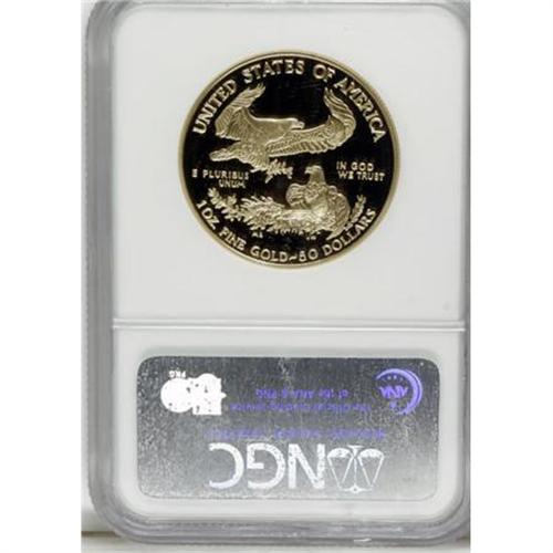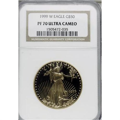 <B>1999-W G$50 One-Ounce Gold Eagle PR70 Deep Cameo NGC.</B></I> NGC Census: (157/0). PCGS Population (9/0). Numismedia Wsl. Price for NGC/PCGS coin in PR70: $1,350. (#9946)<BR><BR><b>Shipping:</b> Coins & Currency (<a target="_blank" href="http://www.heritageauctions.com/common/shipping.php">view shipping information</a>)