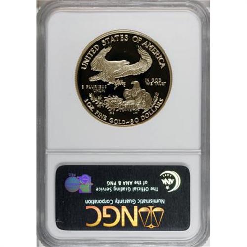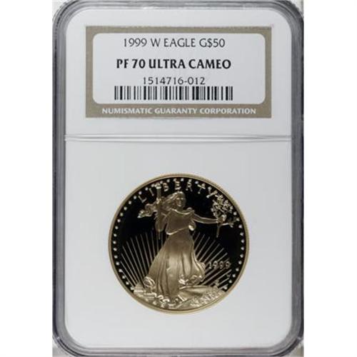 <B>1999-W G$50 One-Ounce Gold Eagle PR70 Deep Cameo NGC.</B></I> NGC Census: (213/0). PCGS Population (20/0). Numismedia Wsl. Price for NGC/PCGS coin in PR70: $1,500. (#9946)<BR><BR><b>Shipping:</b> Coins & Currency (<a target="_blank" href="http://www.heritageauctions.com/common/shipping.php">view shipping information</a>)