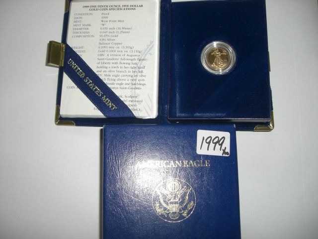 1999-W GOLD AMERICAN EAGLE-WEST POINT MINT U.S. ONE-TENTH OUNCE *PROOF COIN* BOOK VALUE IS $250.00+ COIN COMES IN MINT CASE & BOX!! GOLD COIN CAME OUT OF SAFE!! ***Coin, Currency & All Items Listed in this auction - Grades, Conditions and Values are not Safe Deposit Coins LLC Responsibilty. Grades, Condition and Values are determined by Consigner(s) & Buyers ONLY