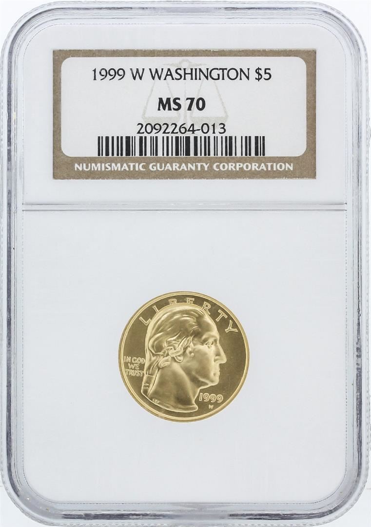 One 1999-W NGC Graded MS70 Washington $5 Commemorative Gold Coin. NGC Certified.