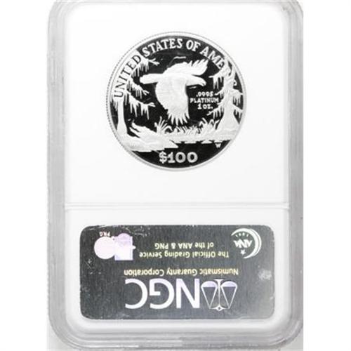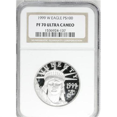 <B>1999-W P$100 One-Ounce Platinum Eagle PR70 Ultra Cameo NGC.</B></I> Second in the Vistas of Liberty series, featuring a reverse showing an eagle overflying southeastern wetlands. One ounce of pure platinum perfection, with the expected silver-on-black contrast.<BR><BR><b>Shipping:</b> Coins & Currency (<a target="_blank" href="http://www.heritageauctions.com/common/shipping.php">view shipping information</a>)
