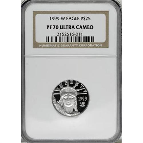 <B>1999-W P$25 Quarter-Ounce Platinum Eagle PR70 Deep Cameo NGC.</B></I> NGC Census: (0/0). PCGS Population (34/0). Mintage: 13,524. Numismedia Wsl. Price for NGC/PCGS coin in PR70: $700. (#99774)<BR><BR><b>Shipping:</b> Coins & Currency (<a target="_blank" href="http://www.heritageauctions.com/common/shipping.php">view shipping information</a>)