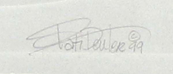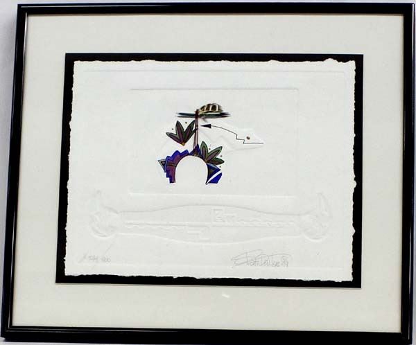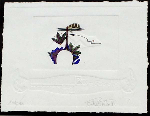 1999 Watercolor & Embossed Print by Pati Deuter, hand signed and numbered, 749/900, embellished with single feather and quills, framed, matted, and under glass, visual measures 7.5'' x 10'', FYI: ''Pati Deuter grew up in Los Alamos, New Mexico. She defines her watercolors as visionary art. Deuter uses a combination of cubism and realism to create a unique style. Pati has been creating embossings for over 25 years.''