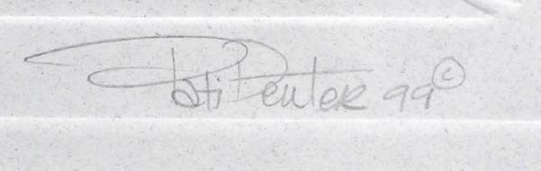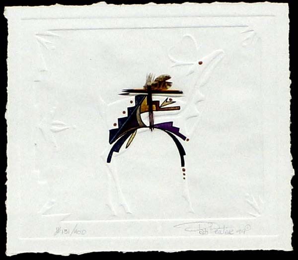 1999 Watercolor & Embossed Print by Pati Deuter, hand signed and numbered, 131/900, embellished with single feather and quills, framed, matted, and under glass, visual measures 7'' x 8'', FYI: ''Pati Deuter grew up in Los Alamos, New Mexico. She defines her watercolors as visionary art. Deuter uses a combination of cubism and realism to create a unique style. Pati has been creating embossings for over 25 years.''
