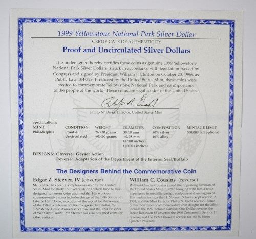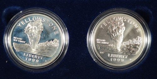 1999 YELLOWSTONE 2 COIN COMMEMORATIVE SET CONTAINS 2 SILVER DOLLARS 1 PR, 1 BU