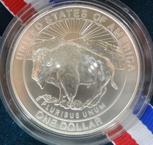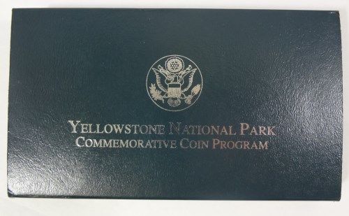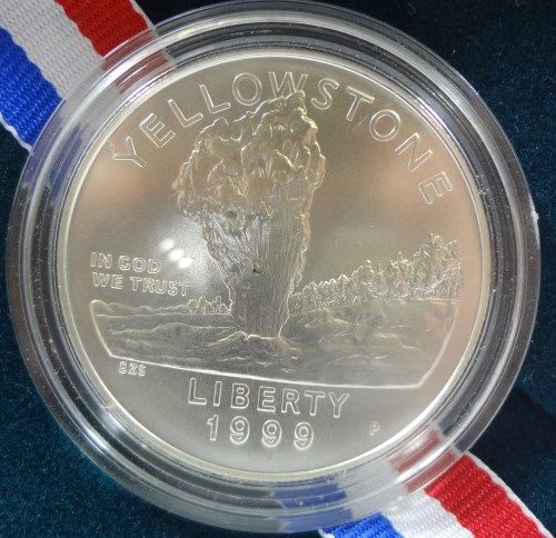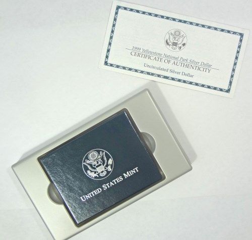 1999 YELLOWSTONE PARK UNCIRCULATED COMMEMORATIVE SILVER DOLLAR, ORIGINAL BOX AN