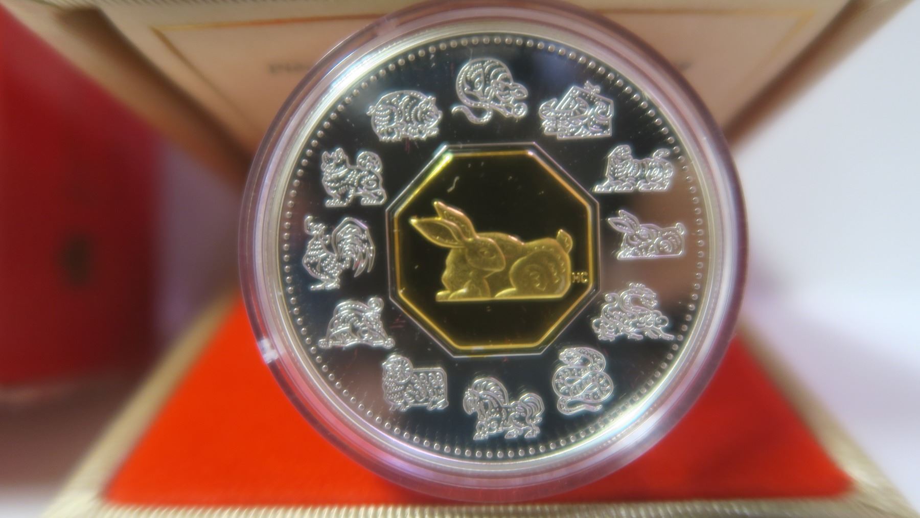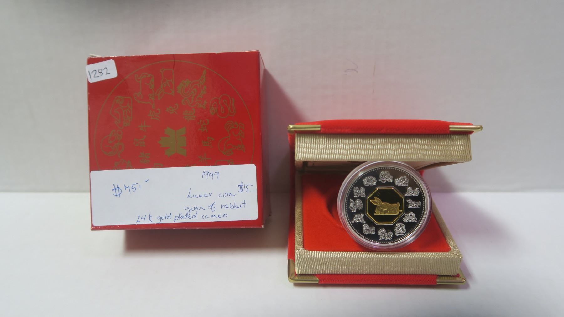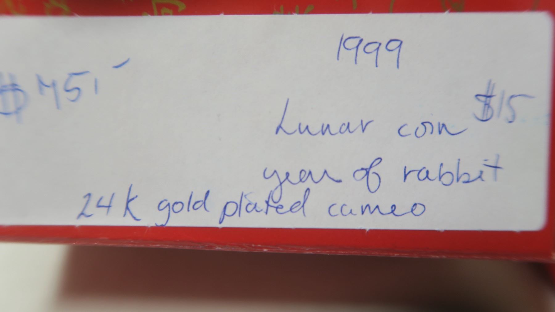 1999 Year of the Rabbit Lunar $15. Sterling Silver with 24-karat Gold Cameo. Proof. In its original case & box of issue.