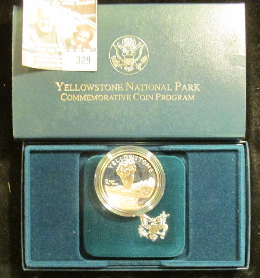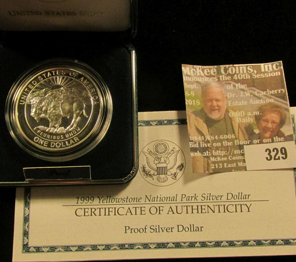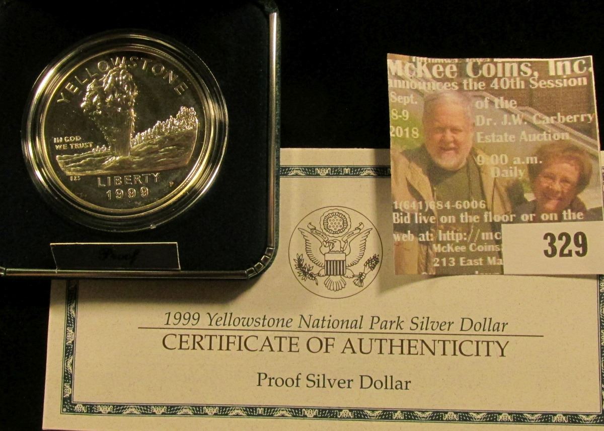 1999 Yellowstone National Park Silver Proof Dollar in original box as issued. CDN bid is $32.00.