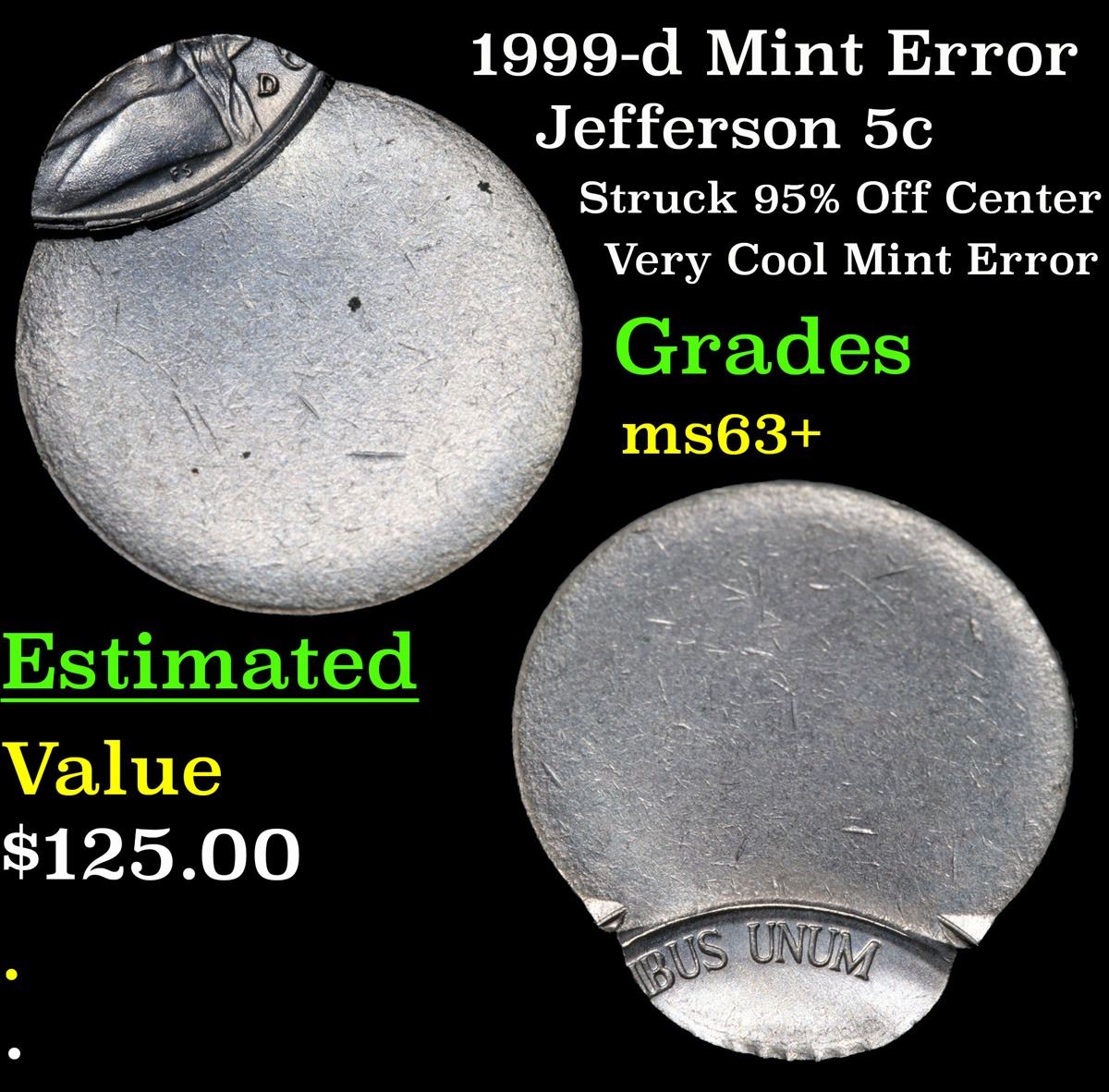1999-d Mint Error Jefferson Nickel 5c Grades Select+ Unc. Very cool Mint Error. When you find a 90 or 95% struck off-center error and the very tiny bit of the coin that made the blank hit exactly enough to determine the date, it is extremely cool, and generally adds significant value.