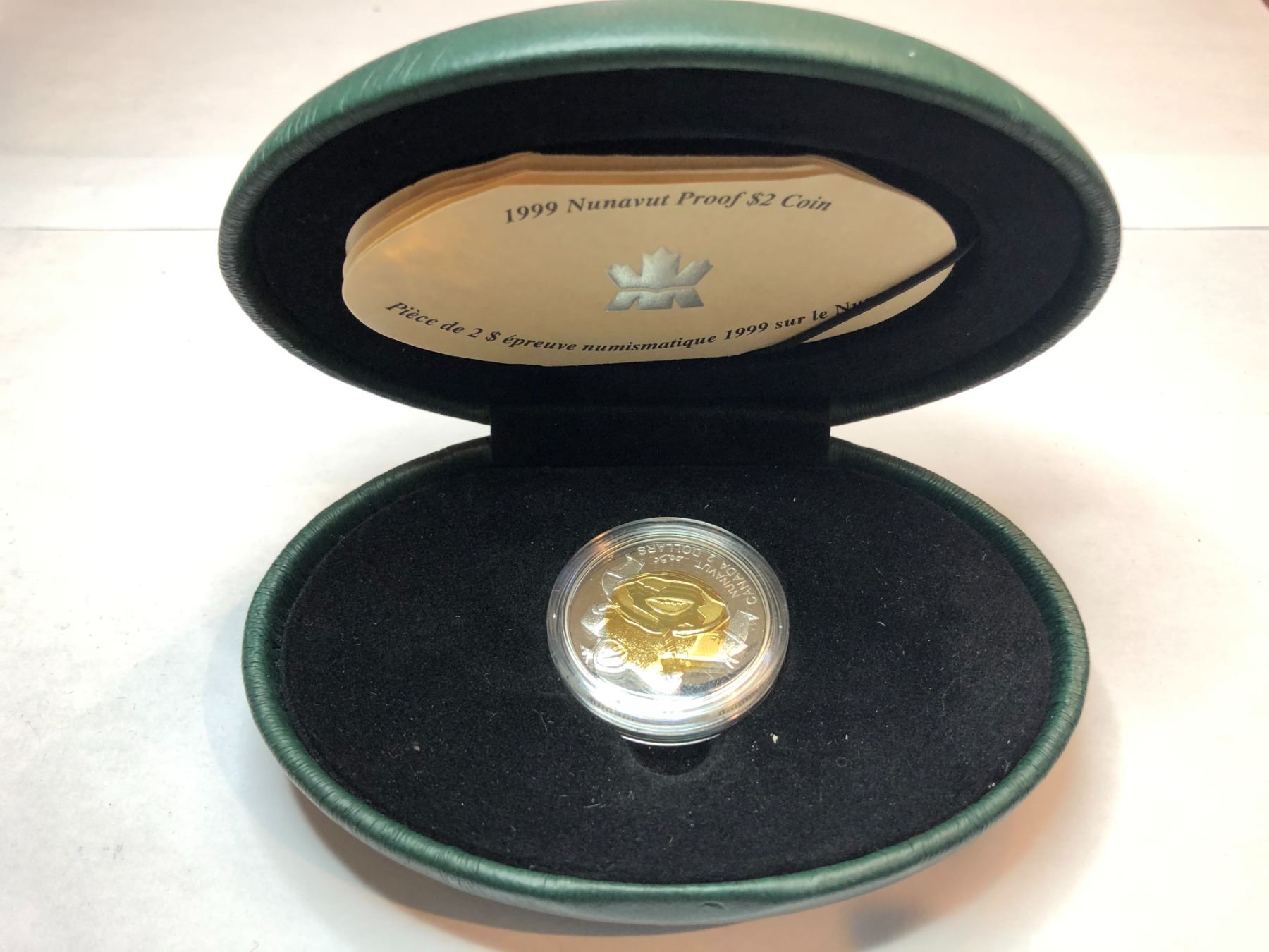 the 1999 nunavut coin is has the classic canadian toonie color scheme and it 92.5 percent with a gold plated inner core and weighs 8.83 grams the proof sets are nickel