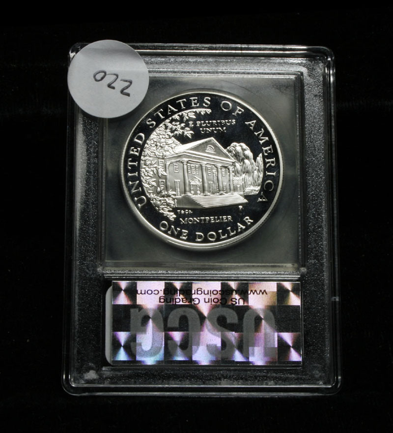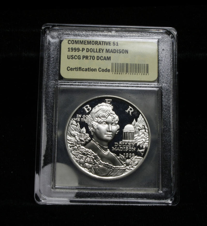 A strikingly beautiful coin. The 1999 Dolley Madison Silver Dollar represents the first time that a First Lady was depicted on a United States coin. Issued to mark the 150th anniversary of her death, this coin is popular with collectors to its beautiful design and unique aspects. This Proof dollar is graded PR70 DCAM by USCG. PCGS lists PR70 as $400. Estimated Value $250.