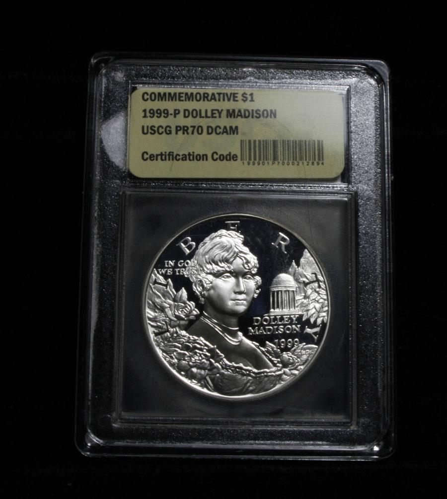 A strikingly beautiful coin. The 1999 Dolley Madison Silver Dollar represents the first time that a First Lady was depicted on a United States coin. Issued to mark the 150th anniversary of her death, this coin is popular with collectors to its beautiful design and unique aspects. This Proof dollar is graded PR70 DCAM by USCG. PCGS lists PR70 as $400. Estimated Value $100.