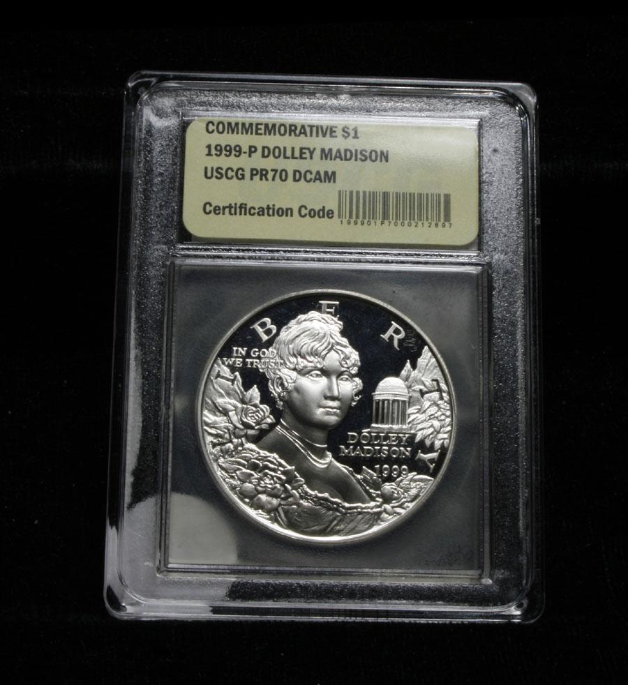 A strikingly beautiful coin. The 1999 Dolley Madison Silver Dollar represents the first time that a First Lady was depicted on a United States coin. Issued to mark the 150th anniversary of her death, this coin is popular with collectors to its beautiful design and unique aspects. This Proof dollar is graded PR70 DCAM by USCG. PCGS lists PR70 as $400. Estimated Value $100.