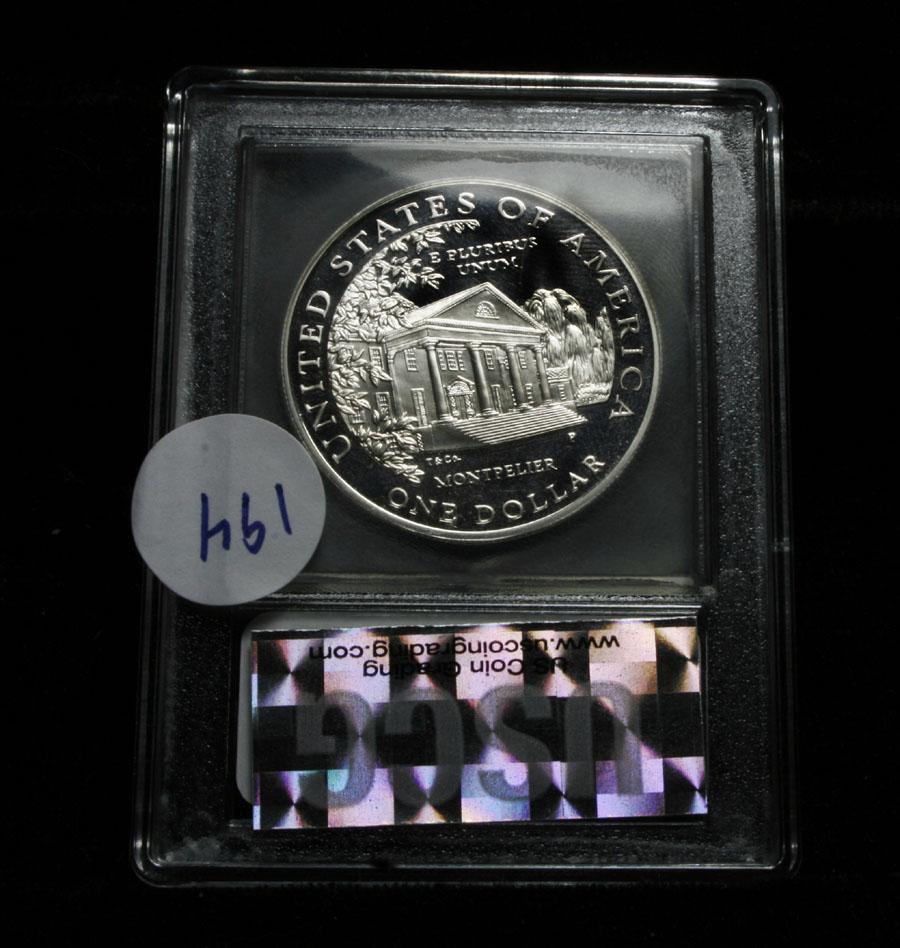 A strikingly beautiful coin. The 1999 Dolley Madison Silver Dollar represents the first time that a First Lady was depicted on a United States coin. Issued to mark the 150th anniversary of her death, this coin is popular with collectors to its beautiful design and unique aspects. This Proof dollar is graded PR70 DCAM by USCG. PCGS lists PR70 as $400. Estimated Value $100.