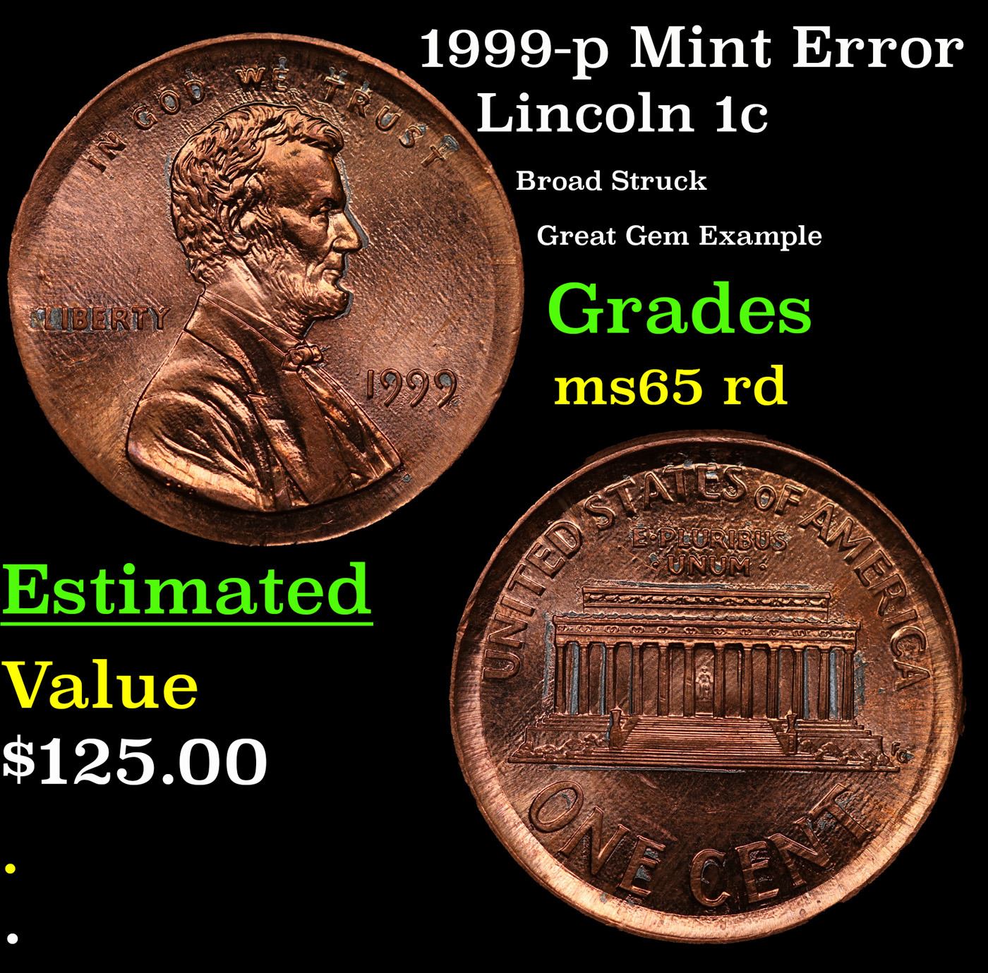 1999-p Mint Error Lincoln Cent 1c Grades GEM Unc RD.
