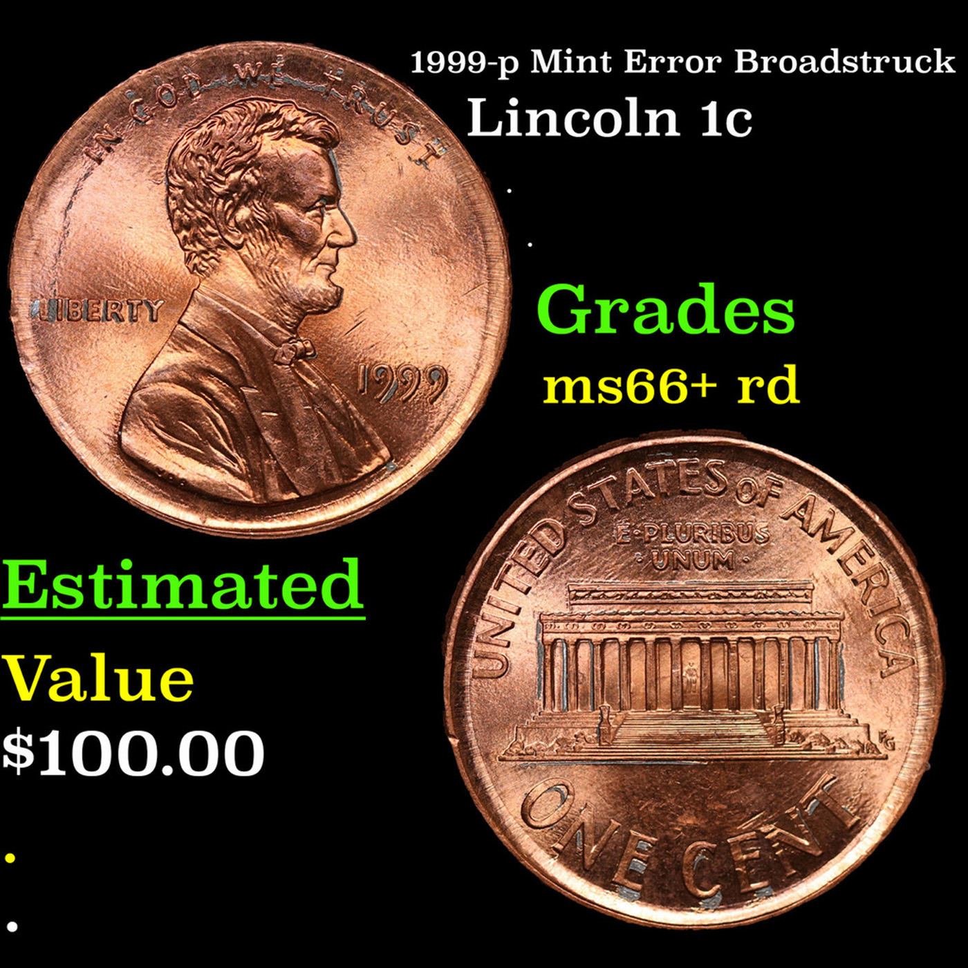 1999-p Mint Error Broadstruck Lincoln Cent 1c Grades GEM++ RD.