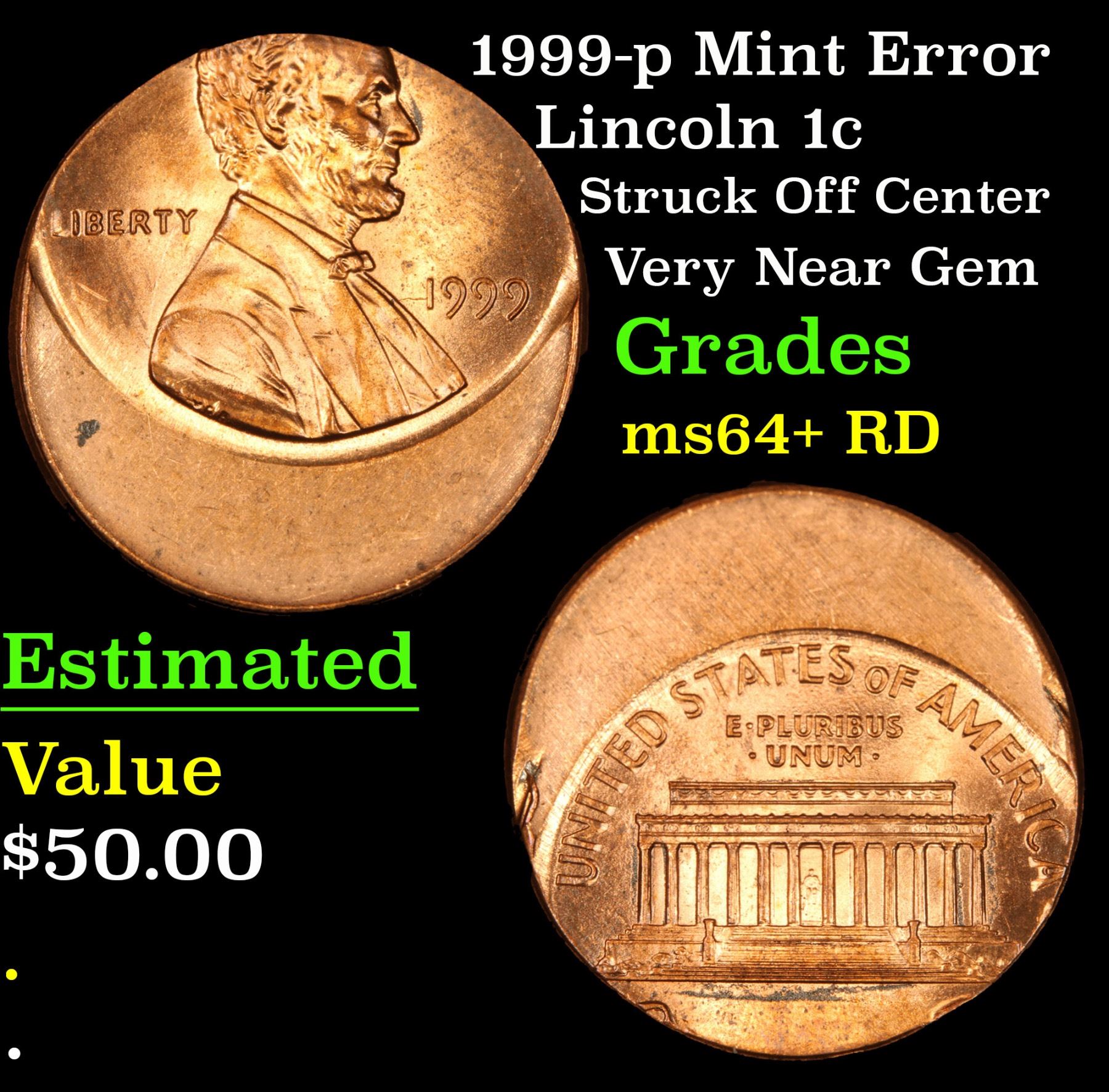 1999-p Mint Error Struck Off Center Very Near Gem Lincoln Cent 1c Grades Choice+ Unc RD.