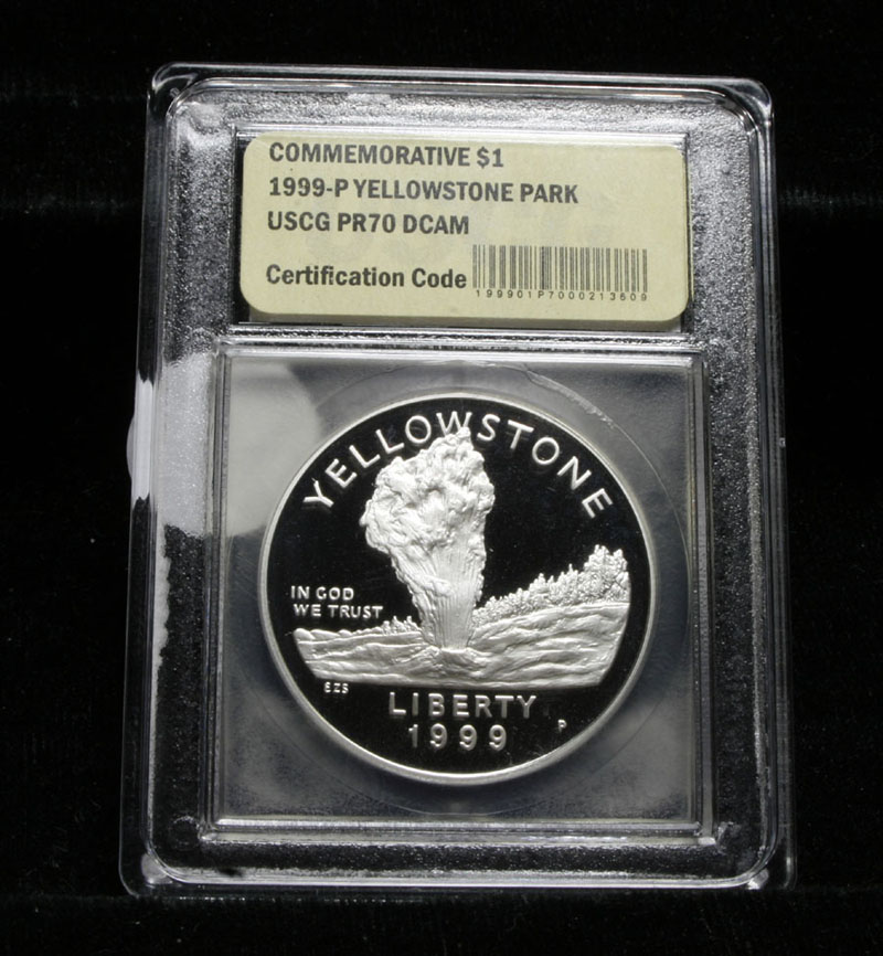 The 1999 Yellowstone National Park Silver Dollar was issued to mark the 175th anniversary of the park's establishment by Congress in 1872. This Proof example was encapsulated and graded by USCG. PCGS Lists PR70 DCAM at $1170, very scarce. Estimated Value $350