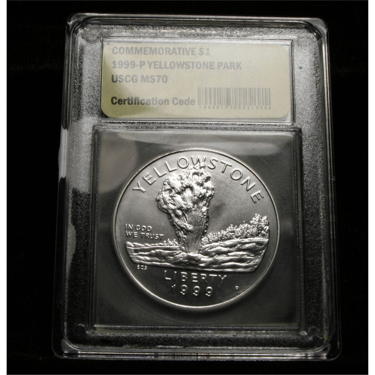 The 1999 Yellowstone National Park Silver Dollar was issued to mark the 175th anniversary of the park's establishment by Congress in 1872. This Proof example was encapsulated and graded by USCG. PCGS Lists ms70 at $550. Estimated Value $200