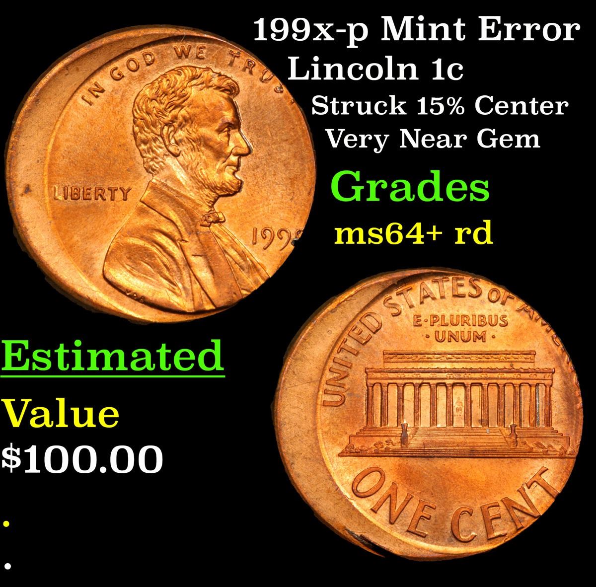 199x-p Mint Error Lincoln Cent 1c Grades Choice+ Unc RD.