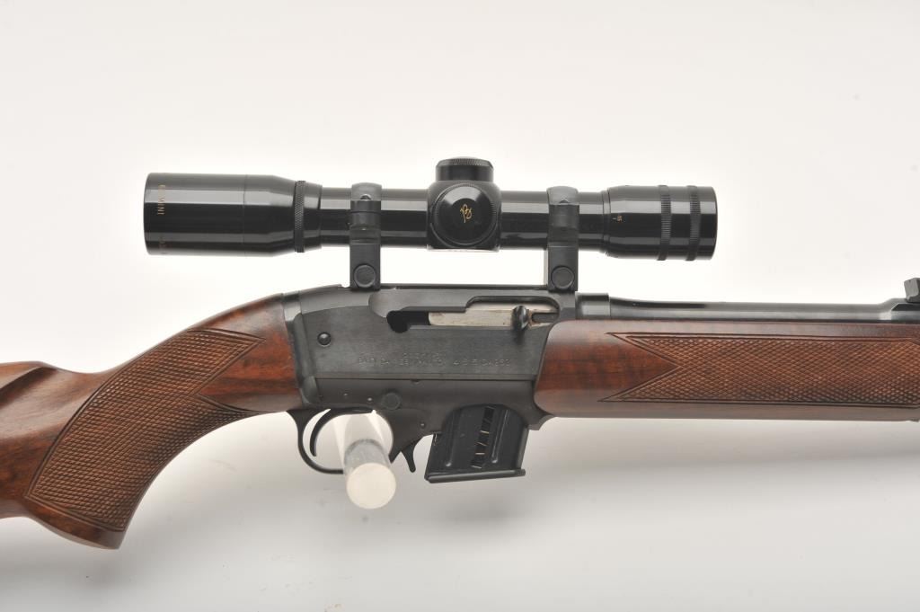 Zbrojovka Brno Model ZKM-611 semi-automatic rifle, .22WMR caliber, import-marked, 20.5” barrel, blued finish, checkered wood stocks, S/N 4 515 04953; mounted with a Burris 6X Mini scope displaying crisp optics; overall fine condition with majority of original finish, fine bore, crisp action, sharp markings and fine stocks. (Modern/NO PPT). Est.: $300-$600.
