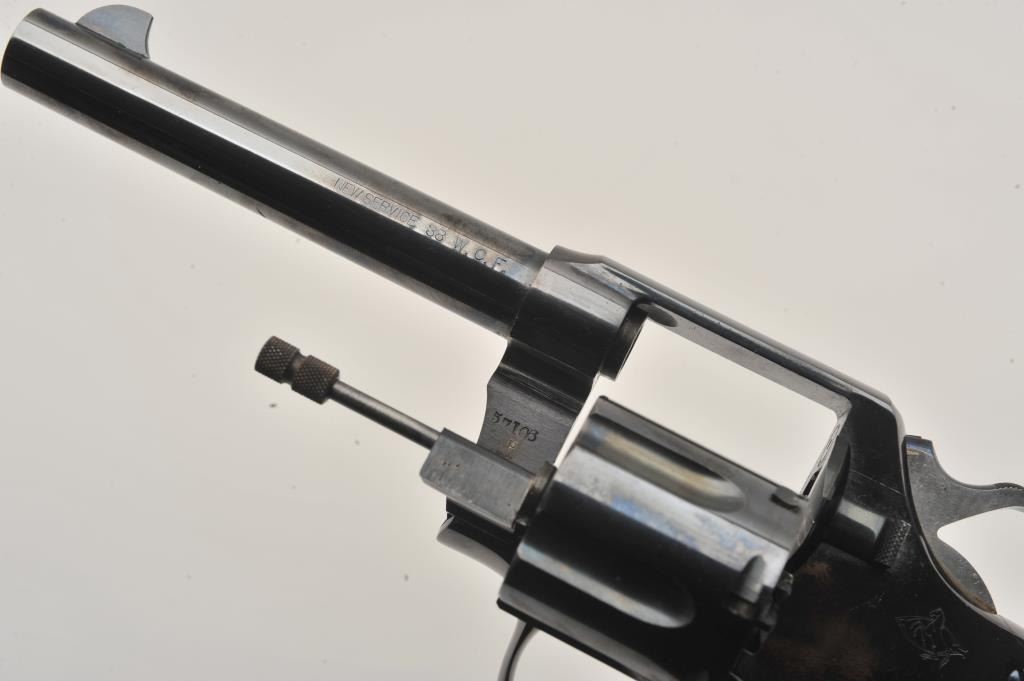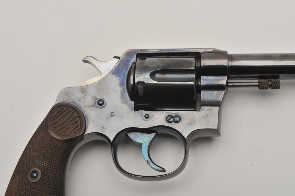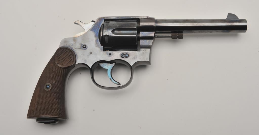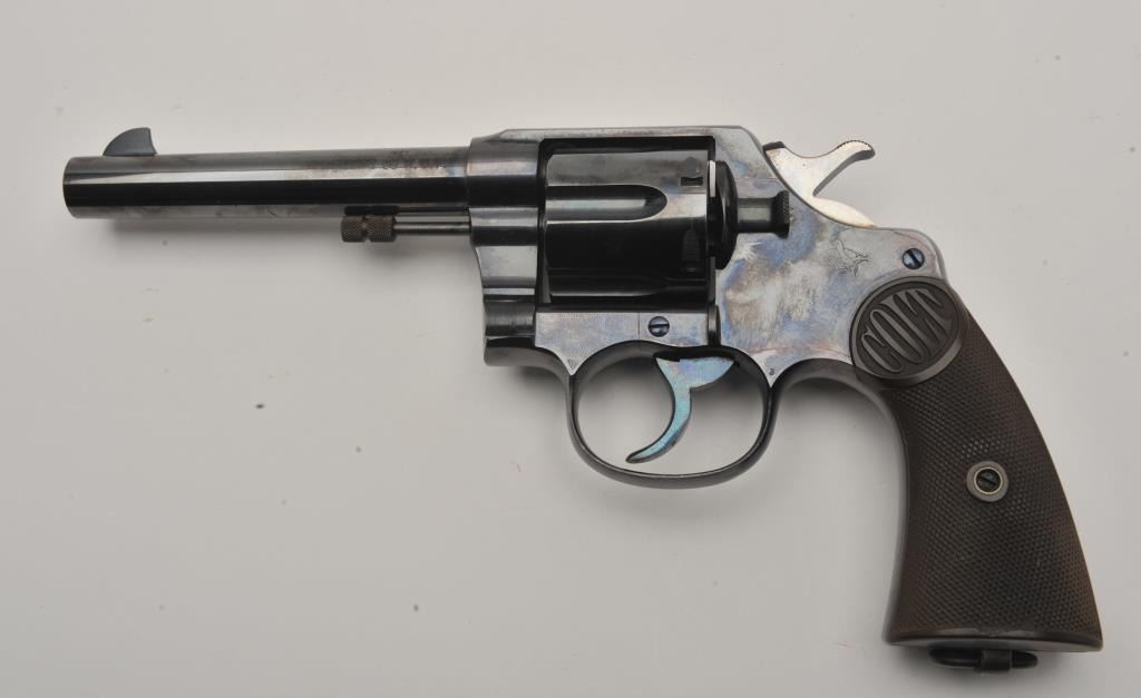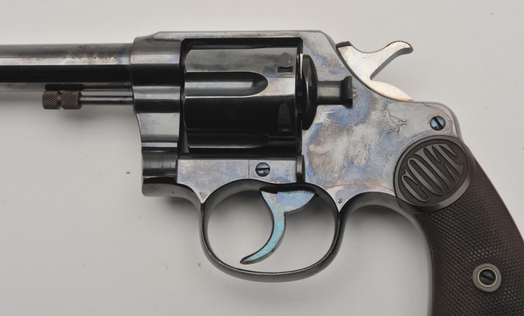 Colt New Service DA revolver, .38 W.C.F. caliber, 5.5” barrel, high polish blued finish, checkered hard rubber grips, lanyard ring, S/N 57106; overall fine condition showing majority of original high polish finish, fine bore, action, markings and grips. (C&R/NO PPT). Est.: $1,250-$2,500.