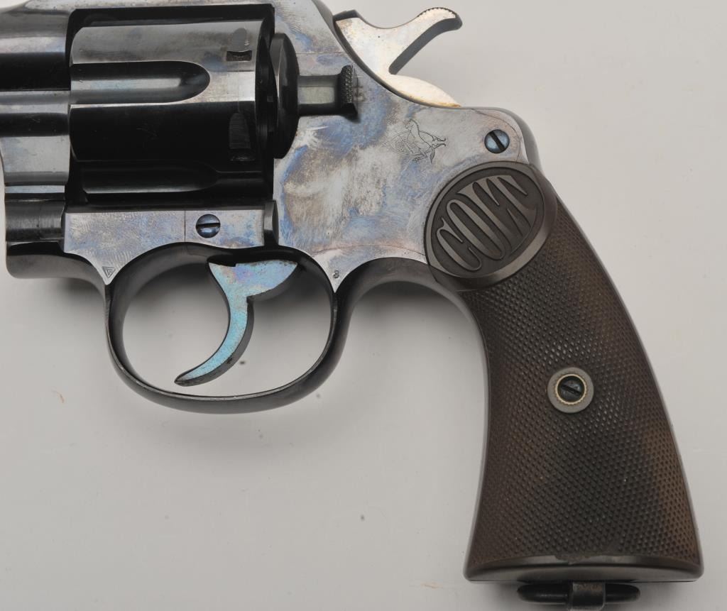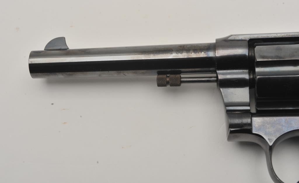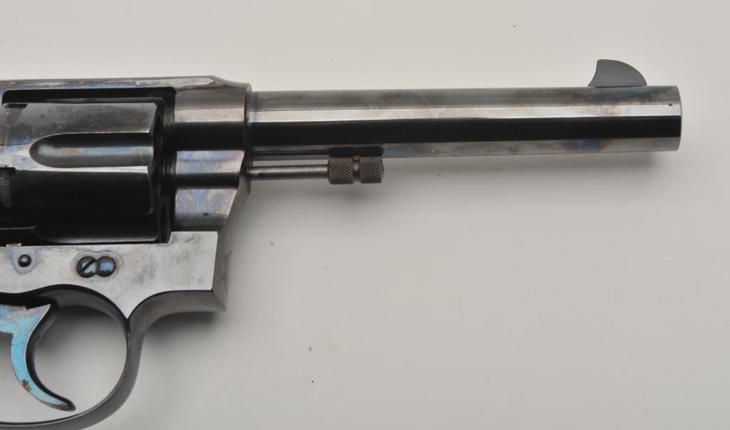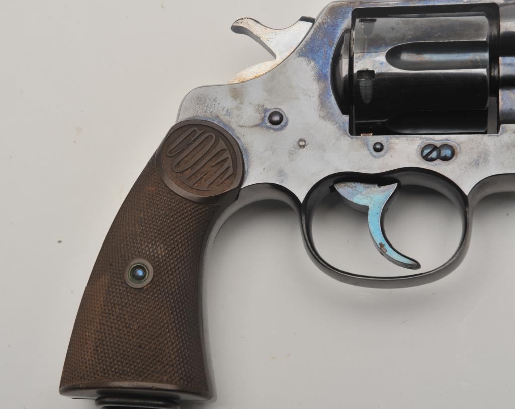 Colt New Service DA revolver, .38 W.C.F. caliber, 5.5” barrel, high polish blued finish, checkered hard rubber grips, lanyard ring, S/N 57106; overall fine condition showing majority of original high polish finish, fine bore, action, markings and grips. (C&R/NO PPT). Est.: $1,250-$2,500.