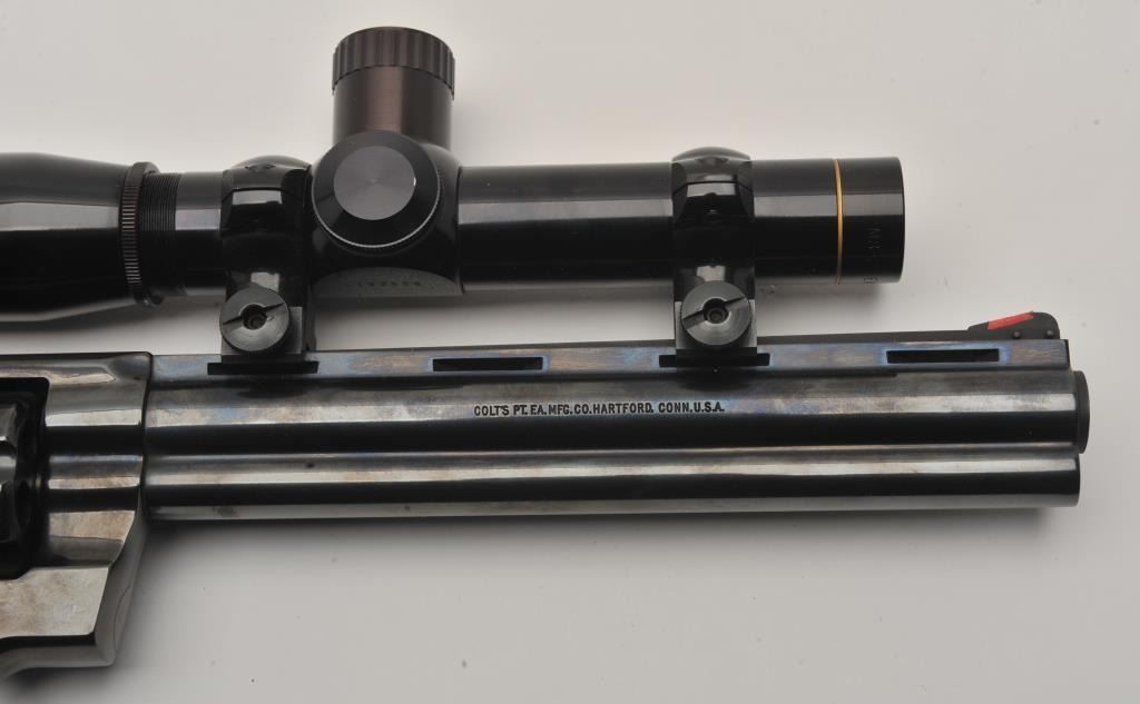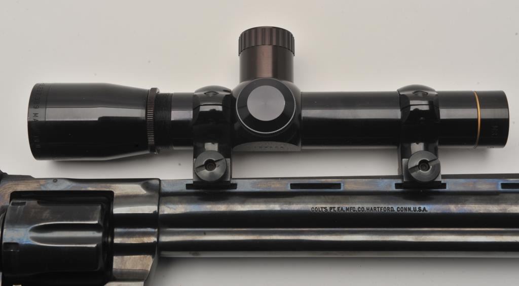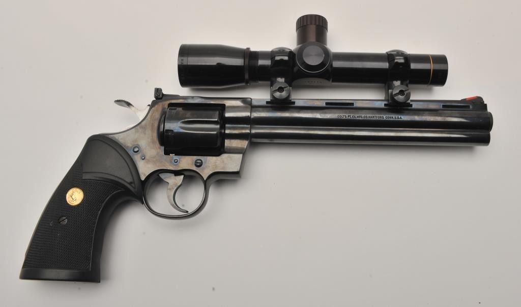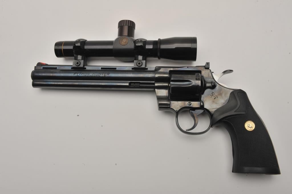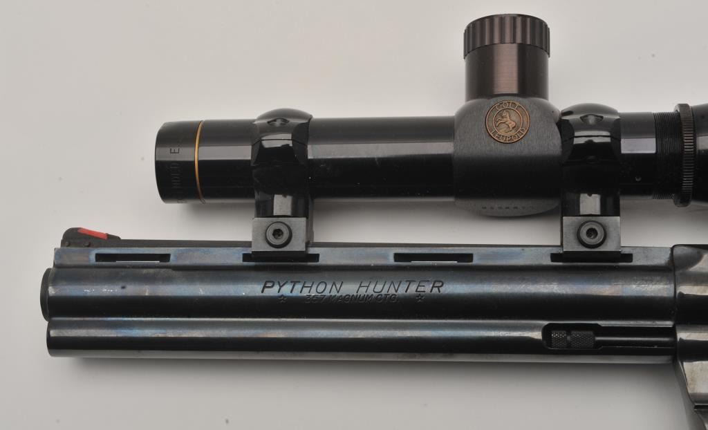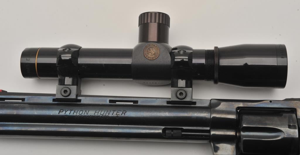 Colt Python Hunter Model DA revolver, .357 Magnum caliber, 8” ventilated rib barrel, blued finish, checkered hard rubber medallion grips, S/N LA4985; mounted with a Colt Leupold-marked M8-2X Extended E.R. scope with crisp optics; overall fine condition displaying majority of original blued finish, fine bore, action, markings and grips. (Modern/NO CALIF. SALE). Est.: $1,500-$3,000.