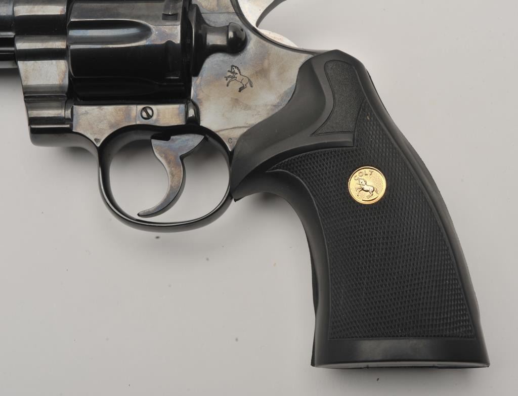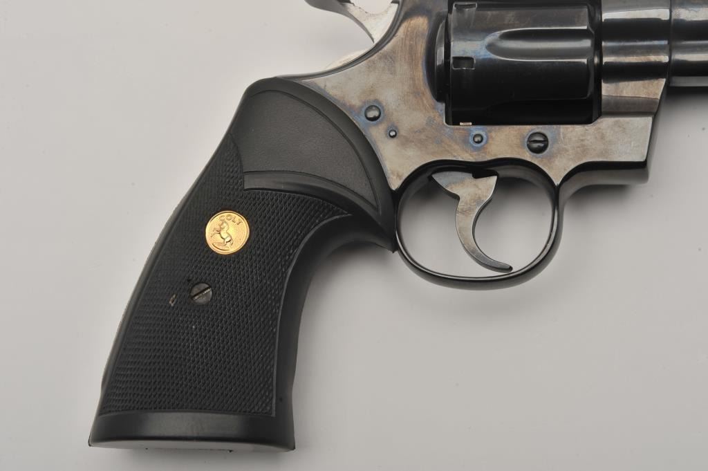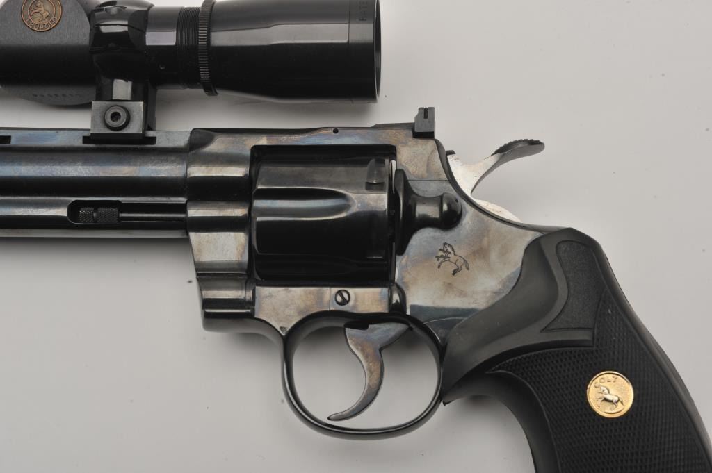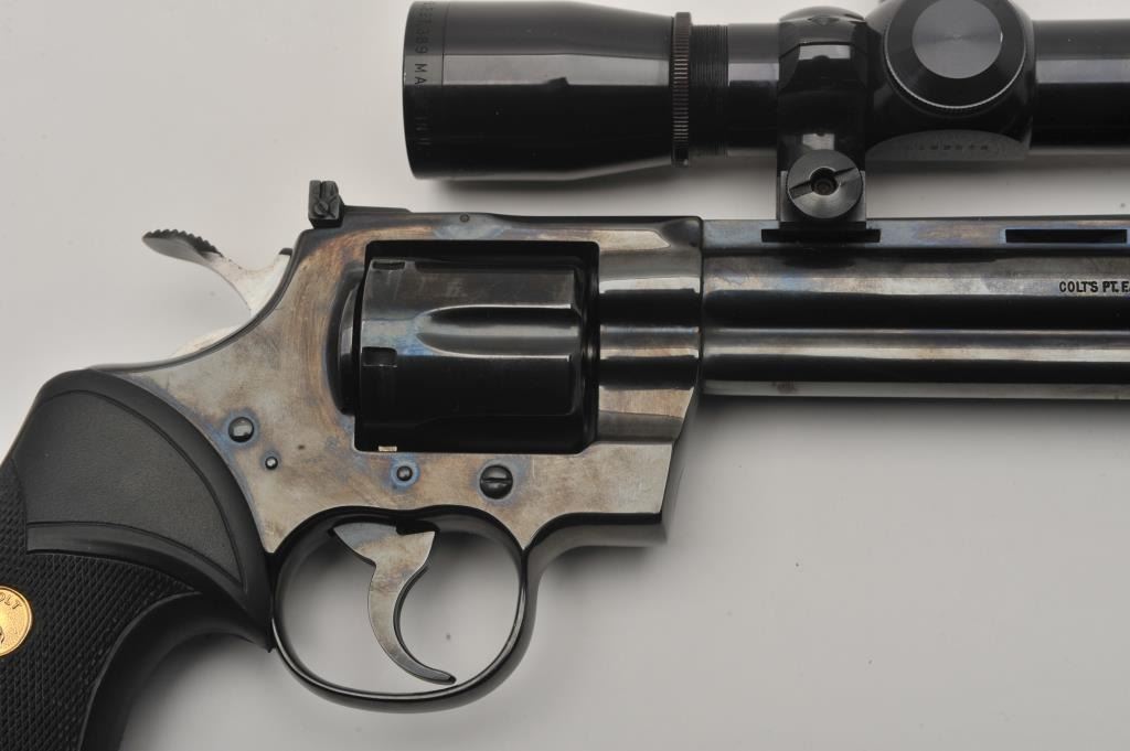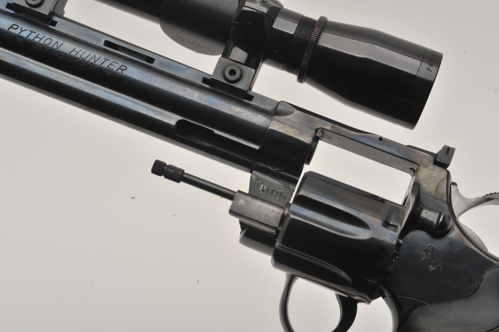 Colt Python Hunter Model DA revolver, .357 Magnum caliber, 8” ventilated rib barrel, blued finish, checkered hard rubber medallion grips, S/N LA4985; mounted with a Colt Leupold-marked M8-2X Extended E.R. scope with crisp optics; overall fine condition displaying majority of original blued finish, fine bore, action, markings and grips. (Modern/NO CALIF. SALE). Est.: $1,500-$3,000.