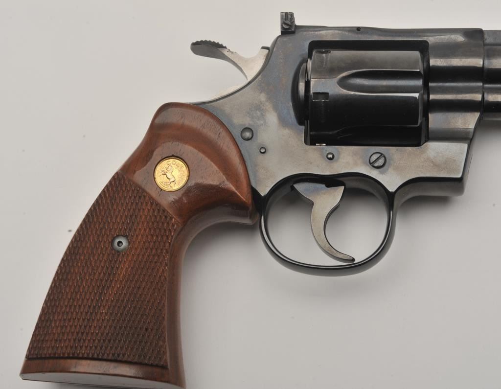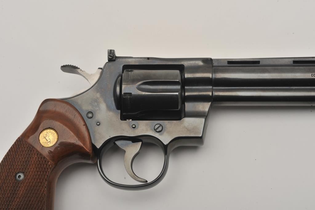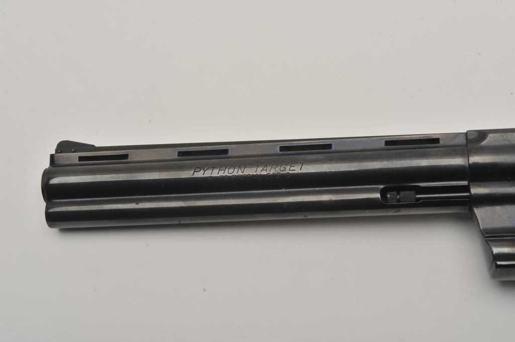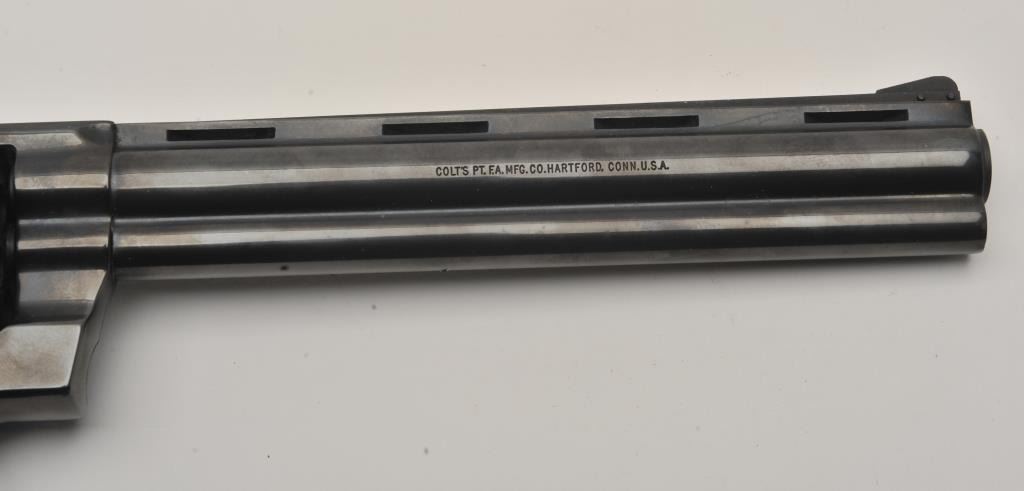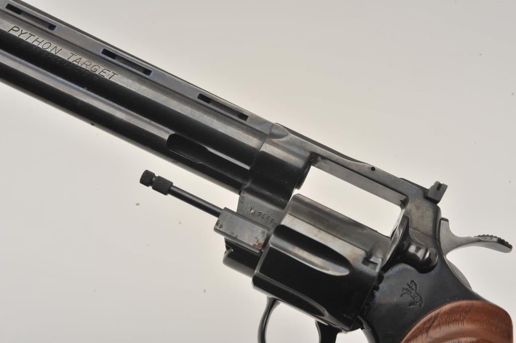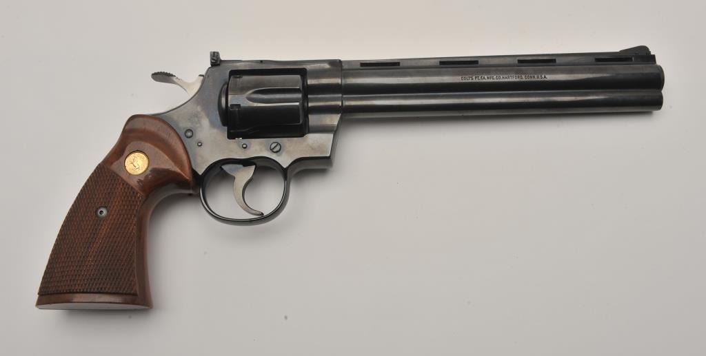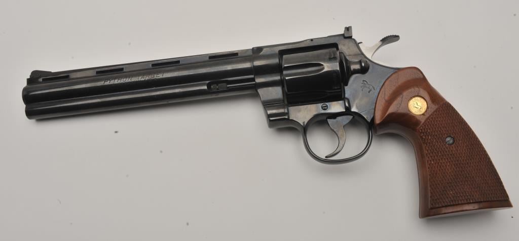 Colt Python Target Model DA revolver, .38 Special caliber, 8” ventilated rib barrel, blued finish, checkered wood medallion grips, S/N VA2458; overall fine condition displaying majority of original blued finish, fine bore, action, markings and grips. (Modern/NO CALIF. SALE). Est.: $1,500-$3,000.