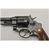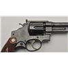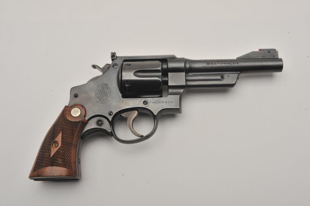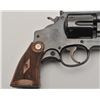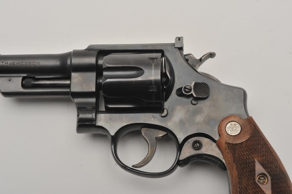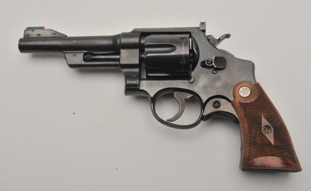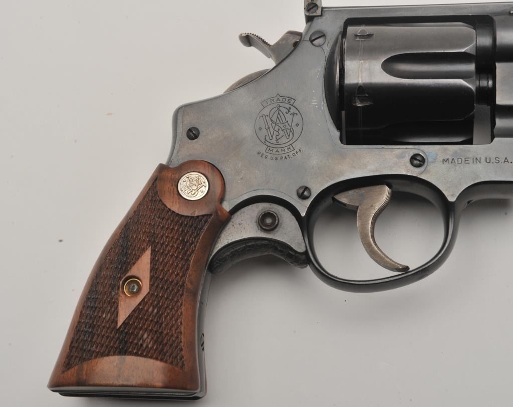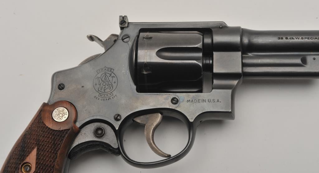 Customized Smith & Wesson 5-screw DA revolver, .38 Special caliber, 5” barrel with King front sight and King cockeyed hammer, also added trigger shoe and replacement S&W medallion checkered wood grips, S/N S 66421; overall good to very good condition as modified; good bore, crisp action very good markings and very good replacement grips; majority of original finish remains. (C&R/NO PPT). Est.: $400-$800.
