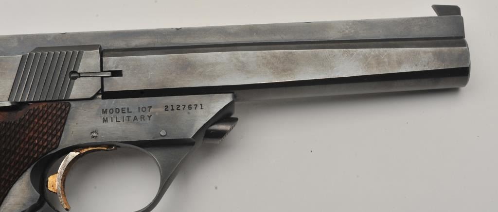 High Standard Supermatic Trophy Model 107 Military semi-automatic pistol, .22 caliber, 5.5” barrel with Giles target barrel rib and sights, blued finish, checkered wood target grips, S/N 2127671; overall very good + condition as modified; near fine bore, action needs work, fine grips. (C&R/NO PPT). Est.: $400-$800.