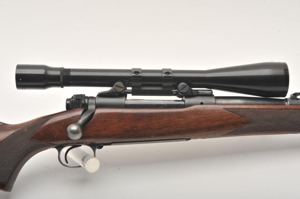 Winchester Model 70 bolt action rifle, .257 Roberts caliber, 24” barrel, blued finish, checkered wood stock, sling swivels, S/N 179319, mounted with a Bausch & Lomb 8x scope with clear optics; rifle is overall good to very good condition displaying majority of original blued finish, good bore, crisp action, very good markings and wood stock with checkered steel butt plate. (C&R). Est.: $500-$1,000.