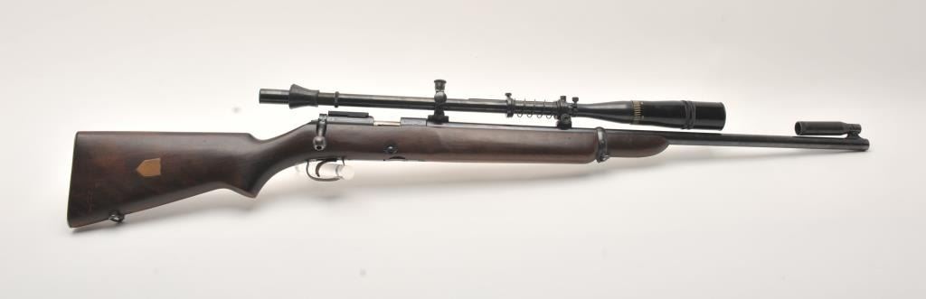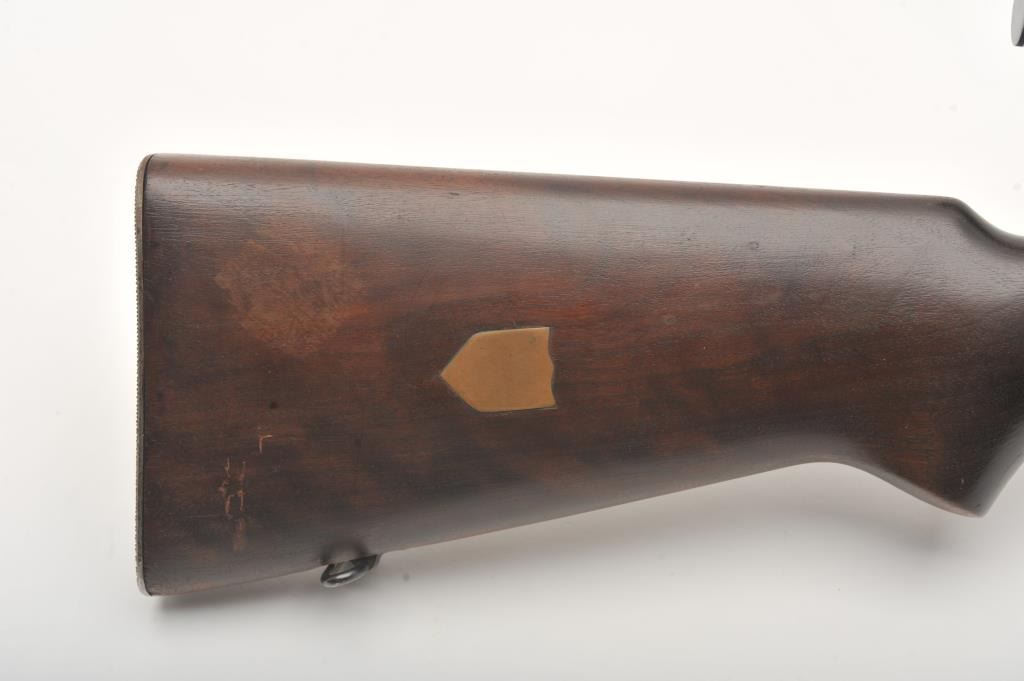 Winchester Model 52 bolt action, magazine fed  target rifle, .22LR caliber, 28” barrel,  blued finish, target wood stock, S/N 42652A;  overall very good to fine condition with a  fine bore, crisp action, sharp markings, majority of original finish remaining, very  good stock with brass inlaid small shield on  right side of butt stock; mounted with a  Lyman Super Targetspot scope displaying clear  optics.        (C&R).      Est.: $600-$1,200.
