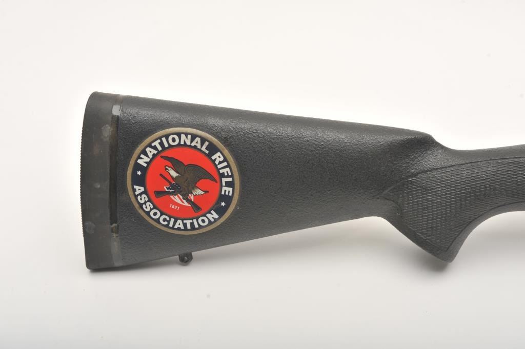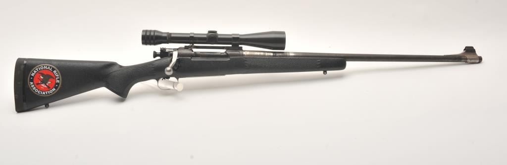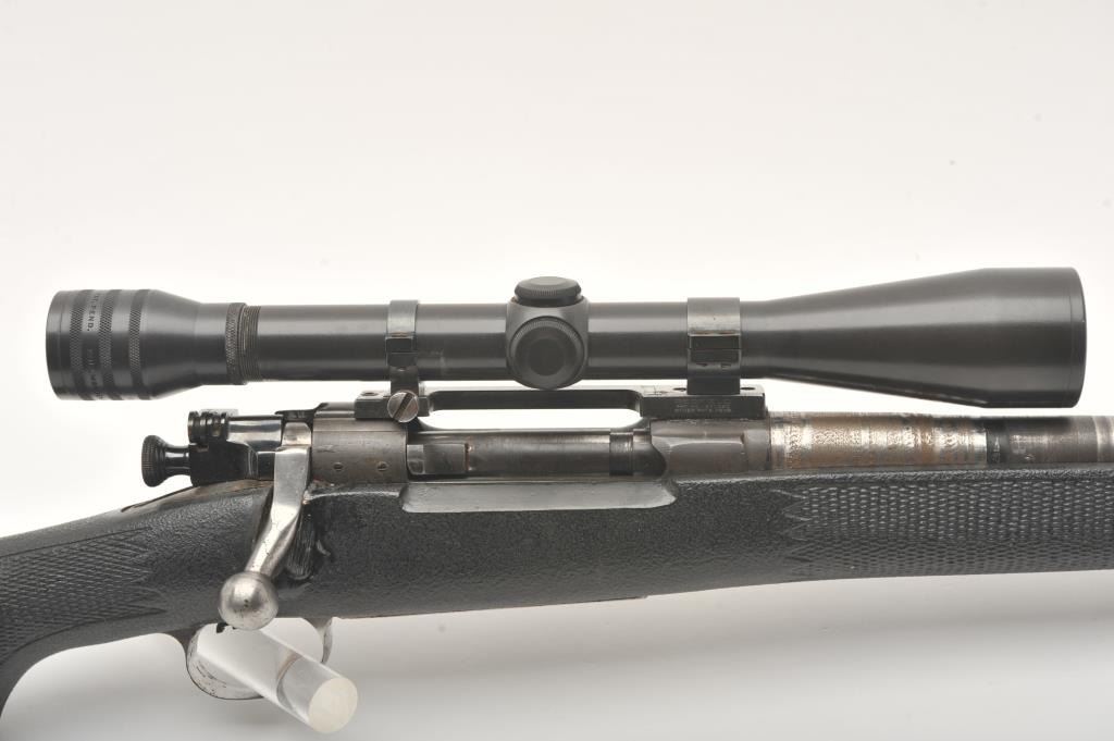Sporterized Model 1903 bolt action rifle, re-worked barrel with no caliber marking, missing trigger but action working; re-stocked with composite semi-pistol grip stock; mounted with a Kollmorgen Optical Corp. scope displaying crisp optics; barrel shows scattered surface rust, very good bore, good stock; needs some gunsmithing attention and cleaning. (C&R). Est.: $200-$400.