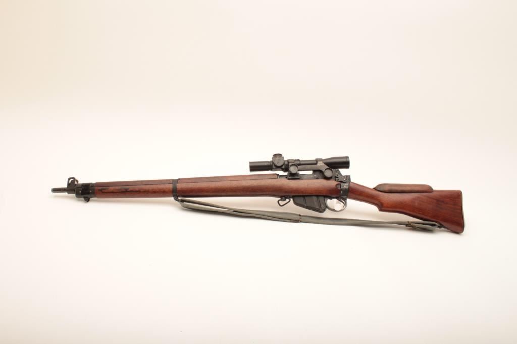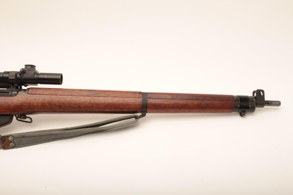 British Enfield No. 4 MK I bolt action sniper rifle, 1943-dated, .303 caliber, 25” barrel, military finish, wood stock with wood cheek piece, blue/grey woven sling, S/N B39798; mounted with an adjustable scope displaying crisp optics; gun is in overall very good + condition showing majority military finish, proofed on muzzle, very good + bore, crisp action, good markings and very good stock with proofs and inspection marks on underside of wrist, front underside of stock also numbered to this gun plus stamped numbers at top of wrist numbered to this gun. A really nice Enfield sniper. (C&R). Est.: $1,500-$3,000.