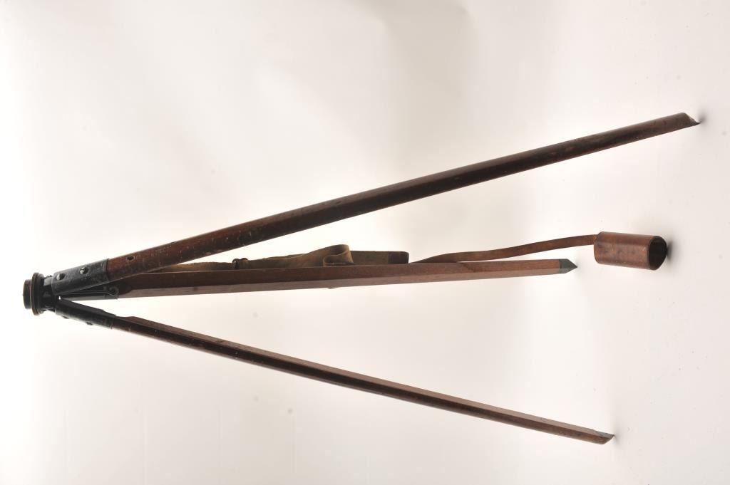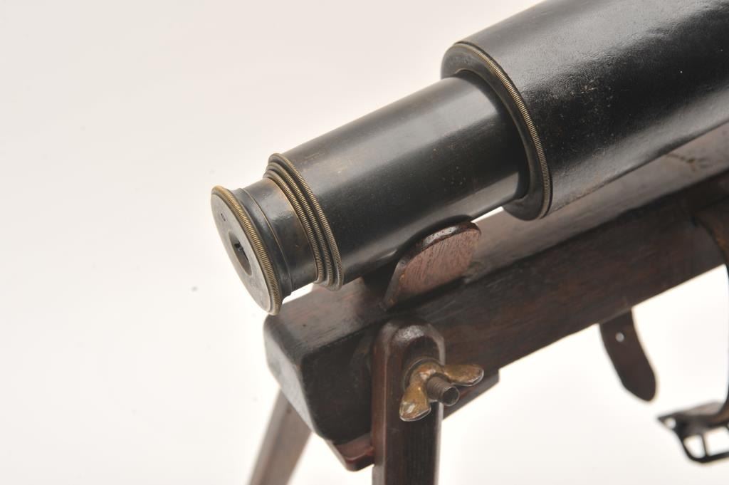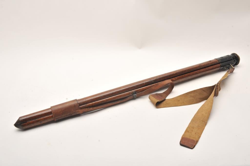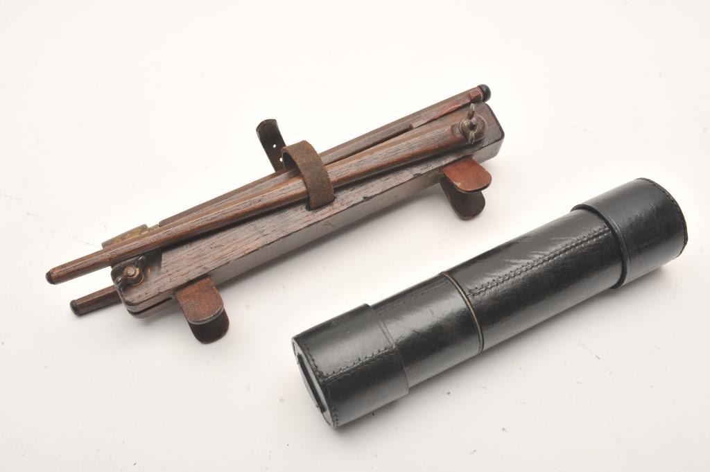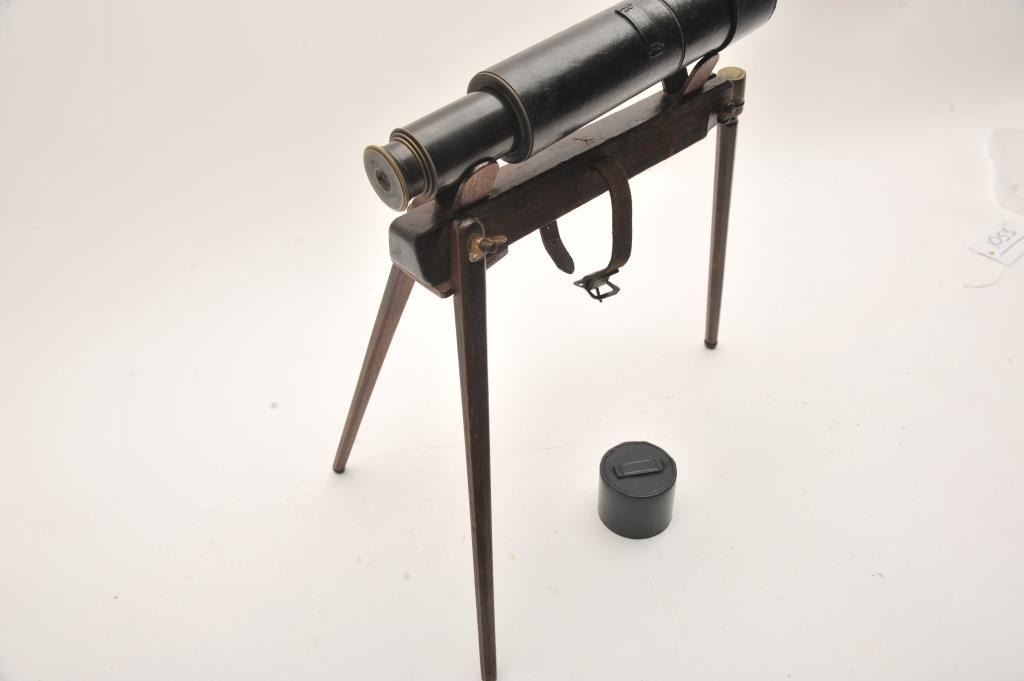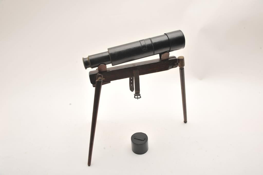 Antique Range scope with leather cover, wood support and wooden tripod. A great decorator for the target shooter or gun enthusiast. Est.: $300-$600.