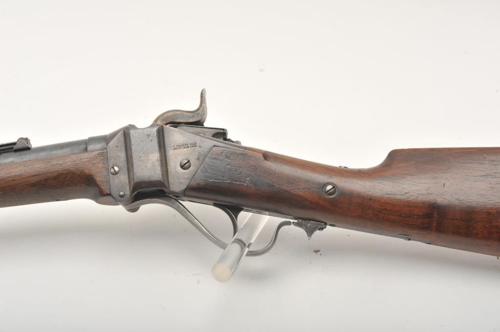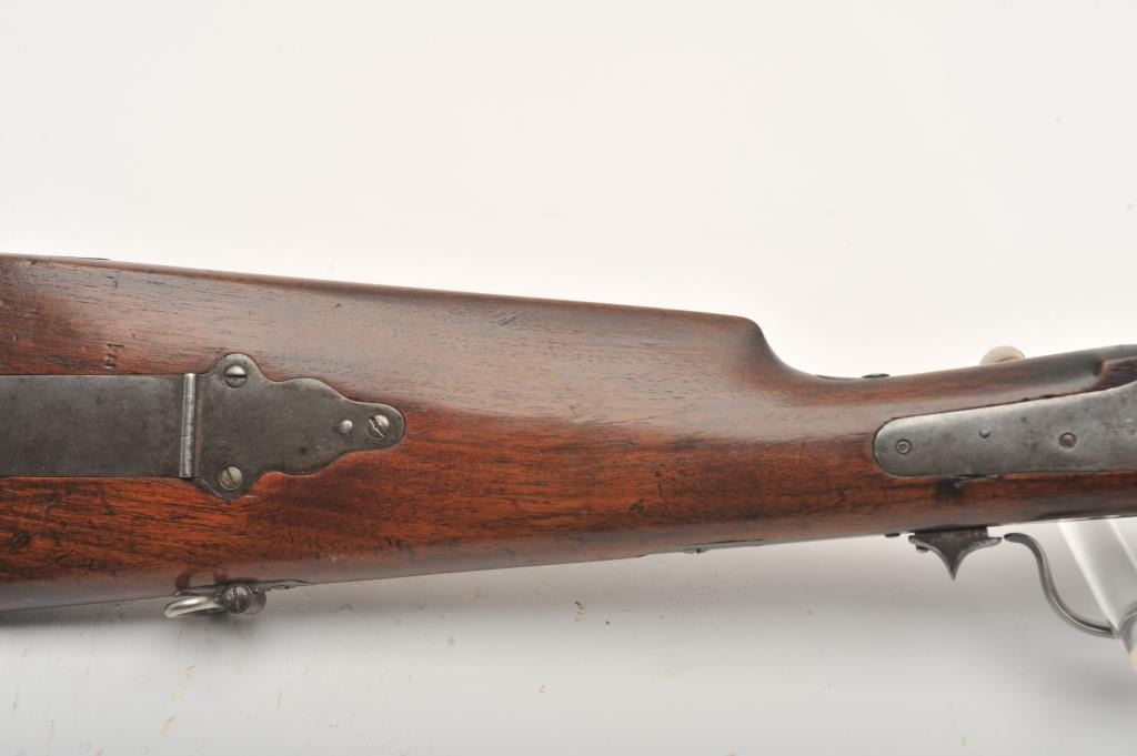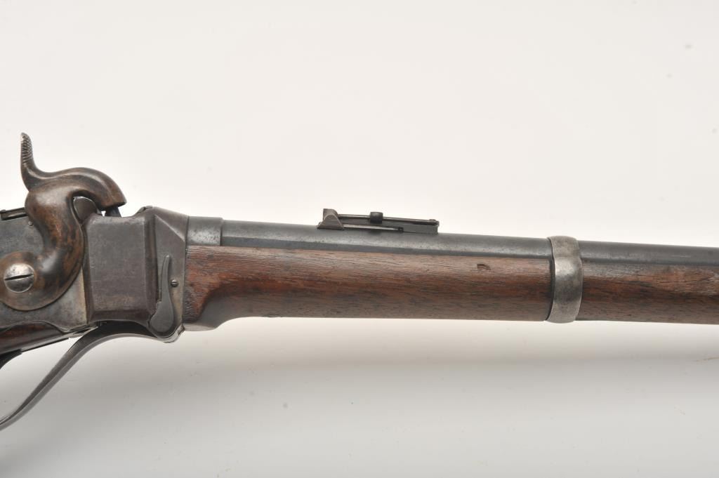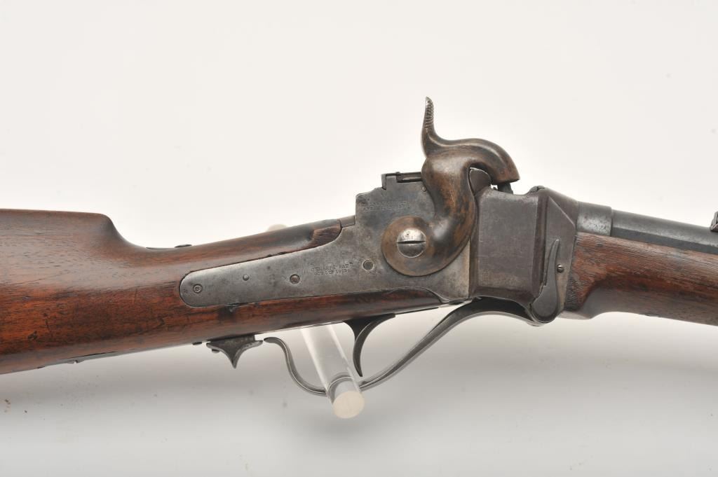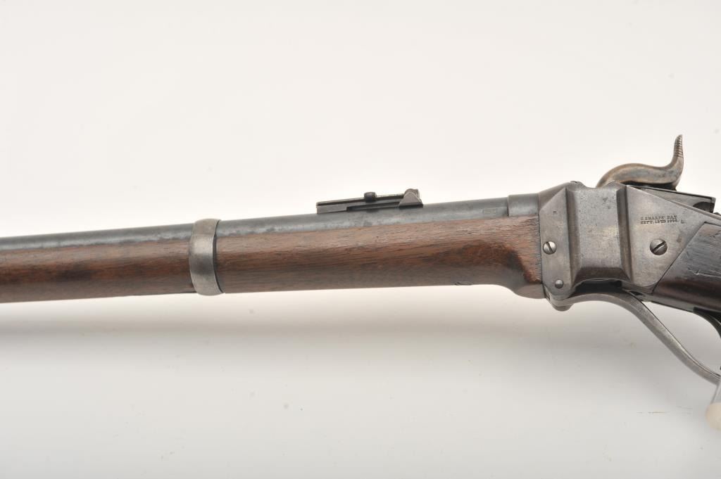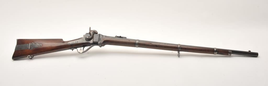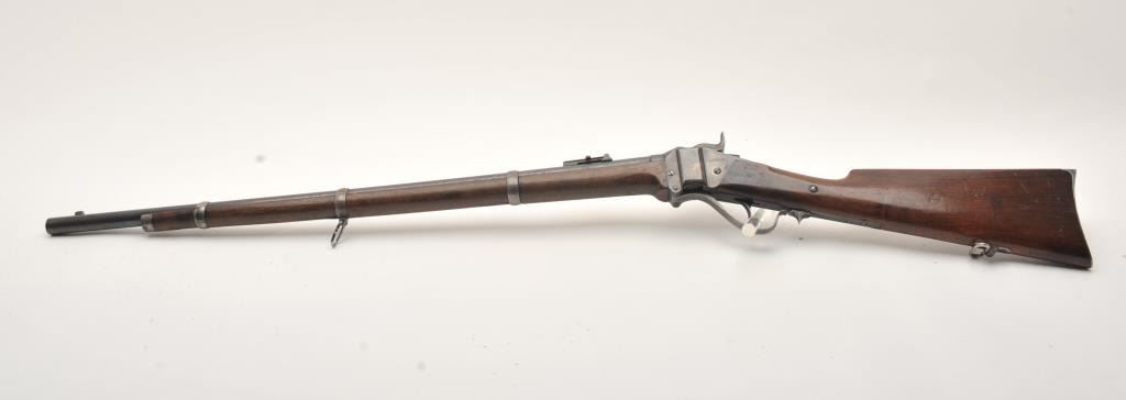 Sharps New Model 1865 percussion military rifle, .52 caliber, 30” barrel, blued and case hardened finish, wood stocks with iron patchbox, S/N C,30269; majority of original blued finish on barrel, traces of case colors on lockplate, crisp action, fine bore, good wood stocks with four inspector’s cartouches on left side of butt stock. (Antique). Est.: $1,500-$3,000.