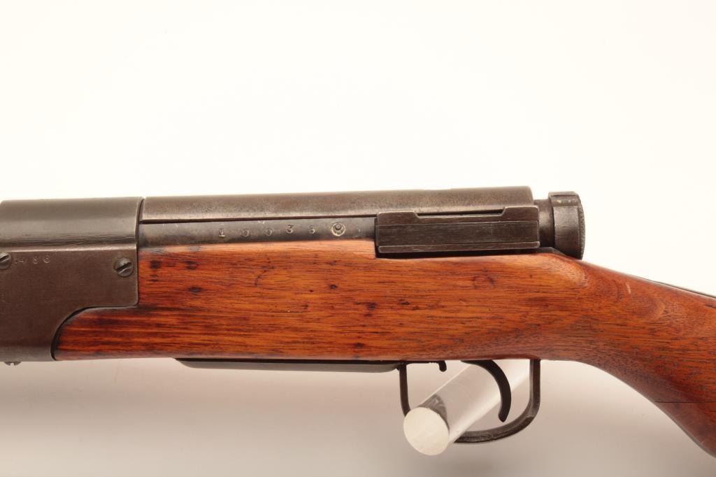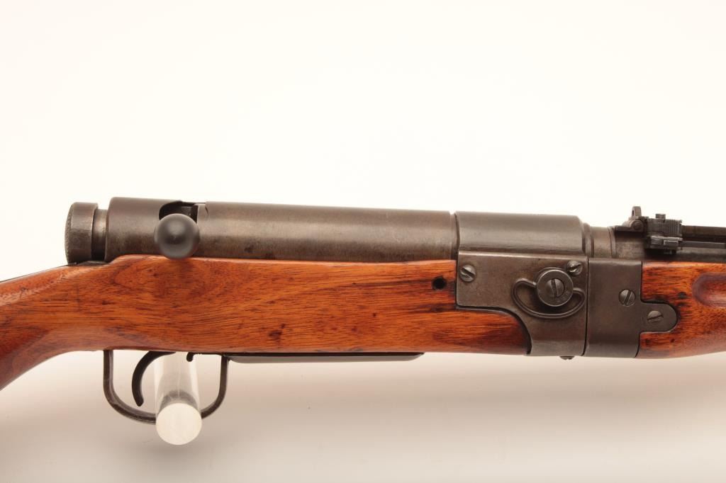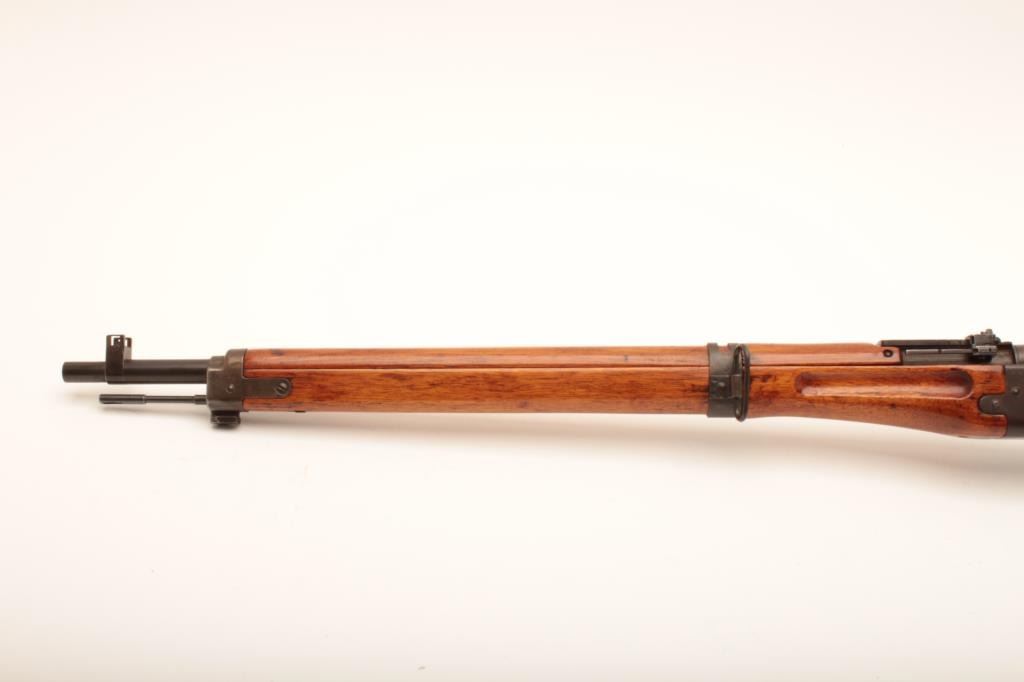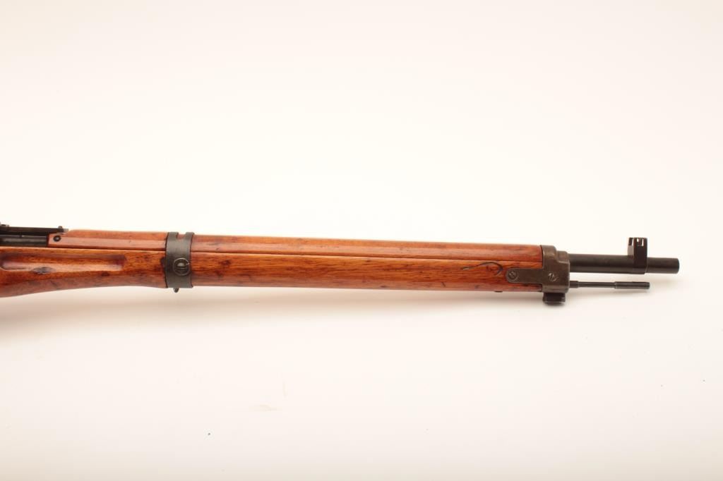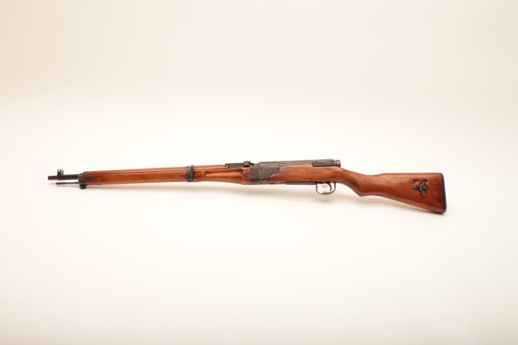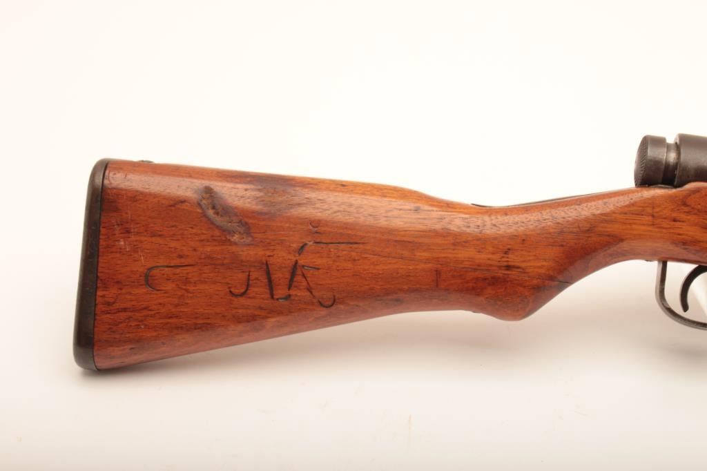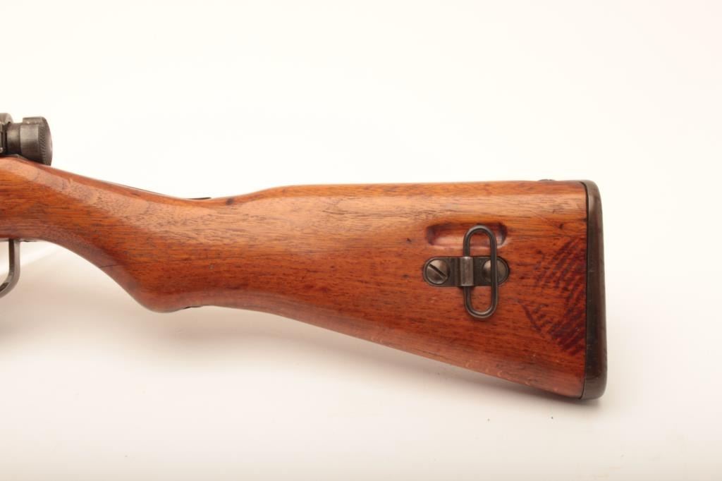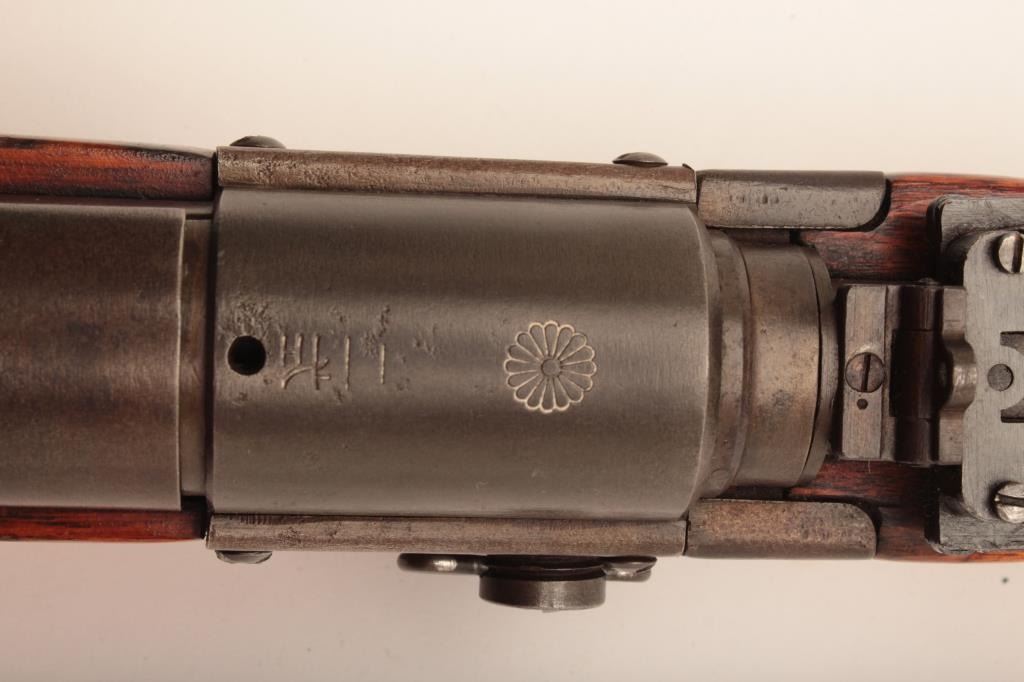 Japanese Arisaka Paratrooper bolt action takedown rifle, 7.7mm caliber, 26” barrel, flip-up rear sight with “aircraft” wings, military finish, wood stocks, mum and Japanese character fully intact, dust cover present, S/N 10038; overall very good + condition with a very good to fine bore, crisp action, sharp markings and even muted military finish remaining on metal surfaces; stock is very good several mars and old indistinguishable markings on the right side of the butt stock; 486 is also marked on the left side of receiver, left side of metal takedown and left side of barrel breech. Hard to find these Japanese Paratrooper rifles in any condition. (C&R). Est.: $1,400-$2,800.