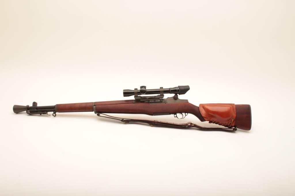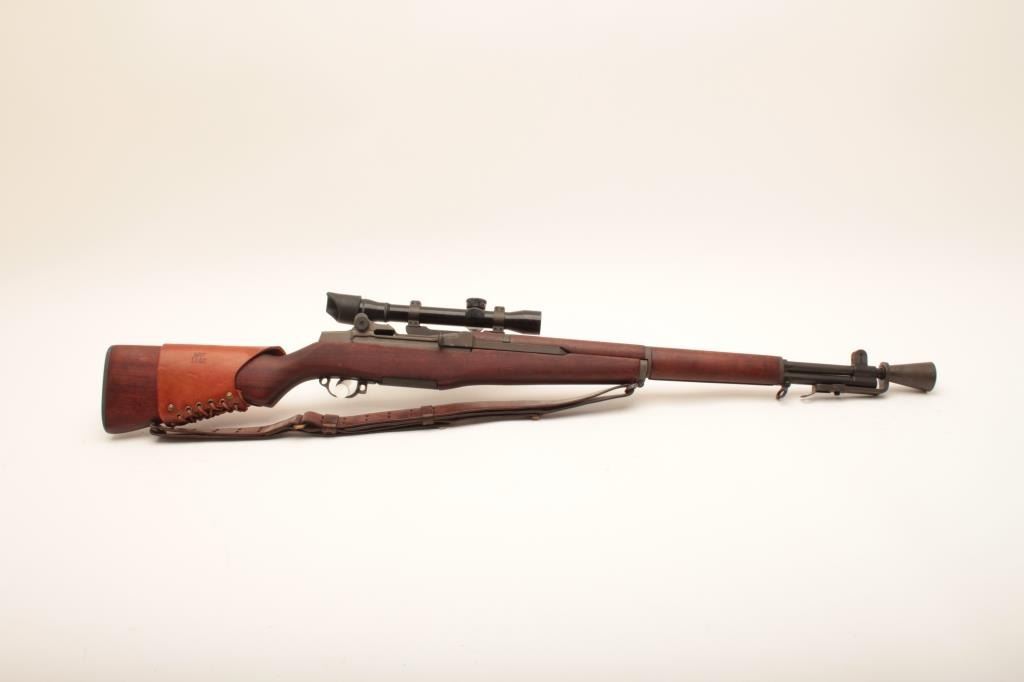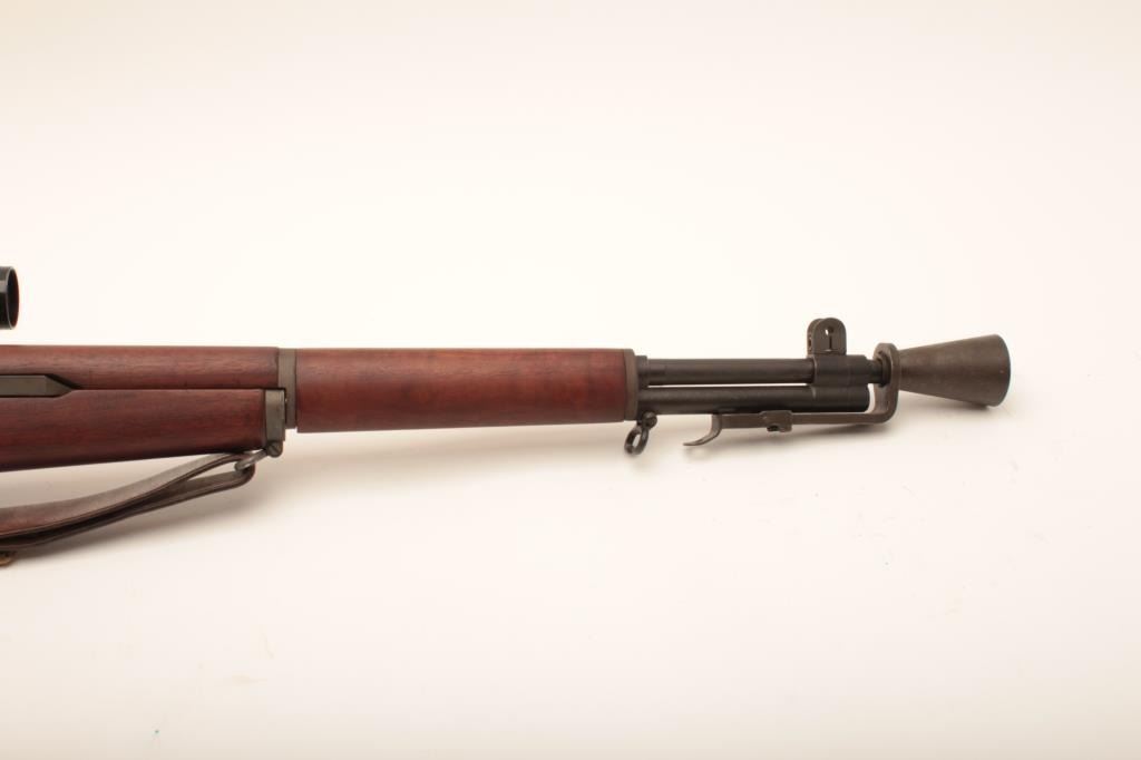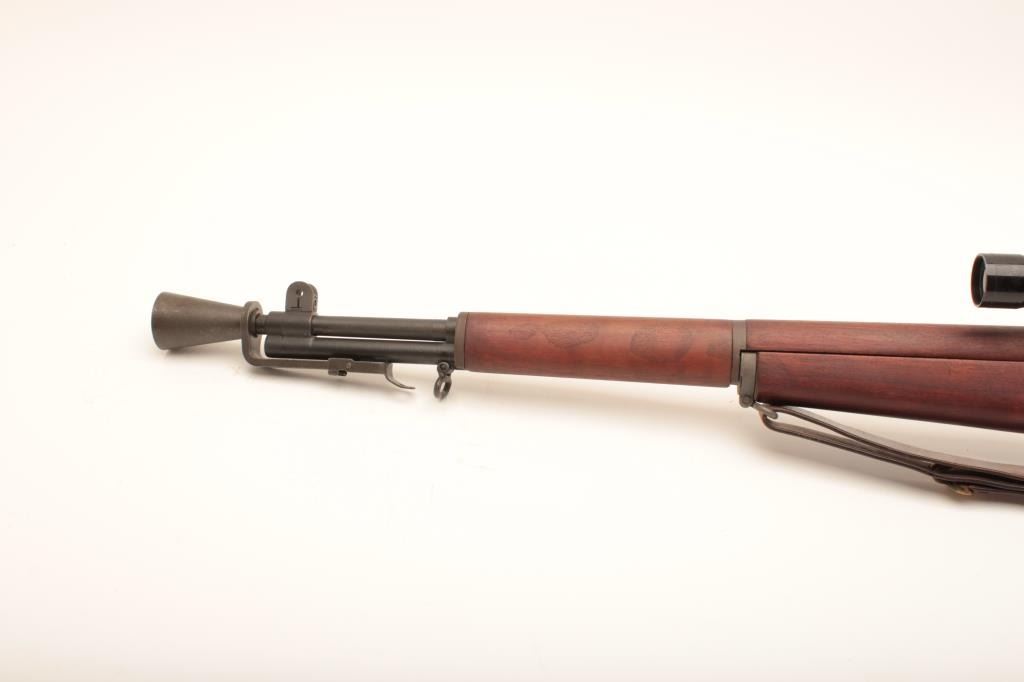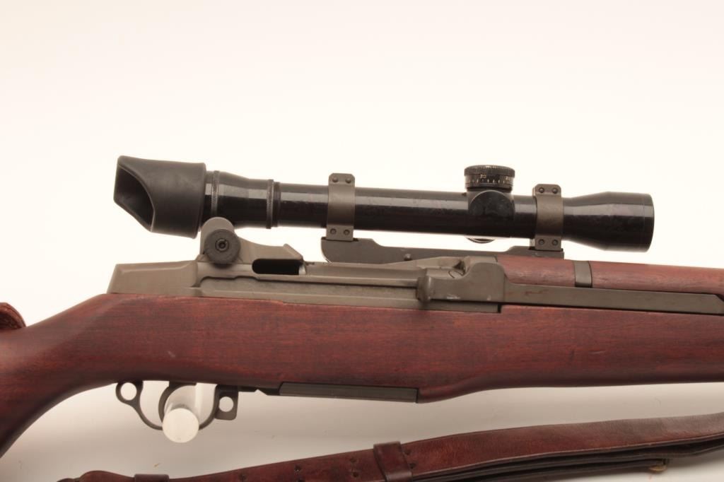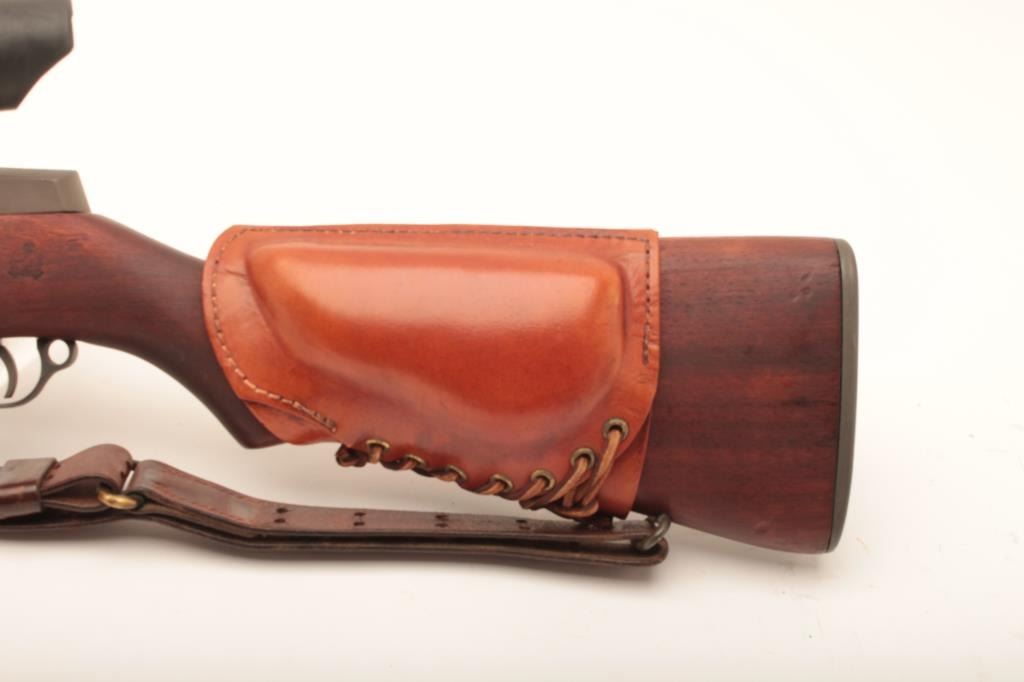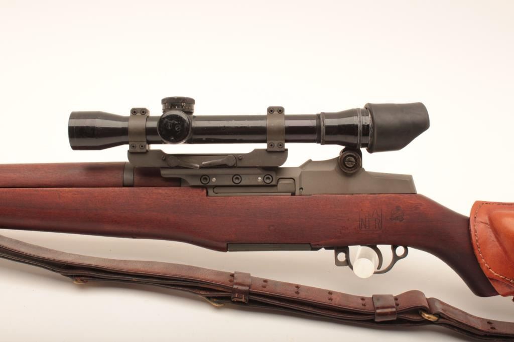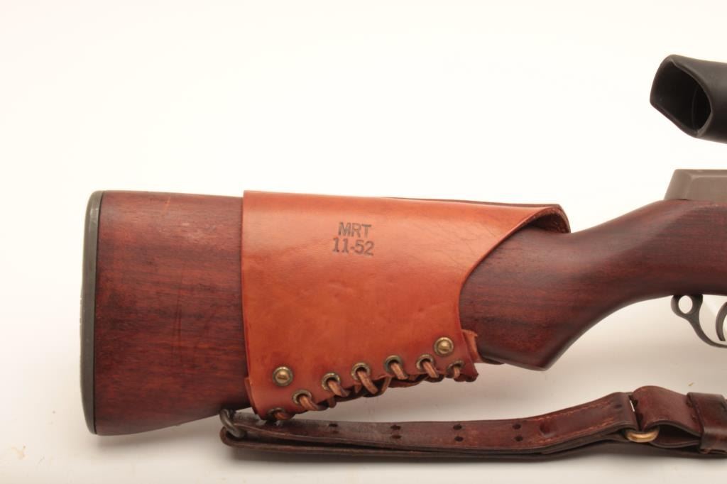U.S. Springfield M1C-52 Garand Sniper semi-automatic rifle, .30 caliber, 24” barrel dated SA 9-52; S/N 3462904; overall good to very good condition as re-finished; bore is good, action is smooth, markings are clear; stock is in very good condition showing an SA/NFR cartouche, circle P proof and a straight re-build P proof; with Stith-Kollmorgen scope showing light use with good optics; the base is S/N to receiver; the mount shows no S/N; leather cheek pad dated MRT 11-52 and a Hart cone flash hider; old military leather sling present. (C&R). Est.: $2,000-$4,000.