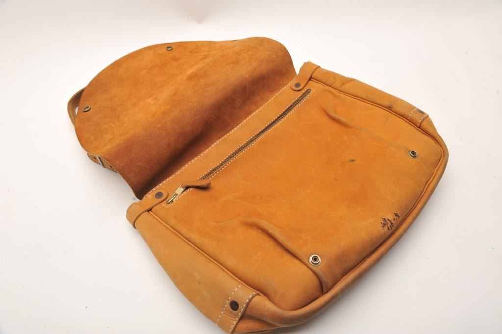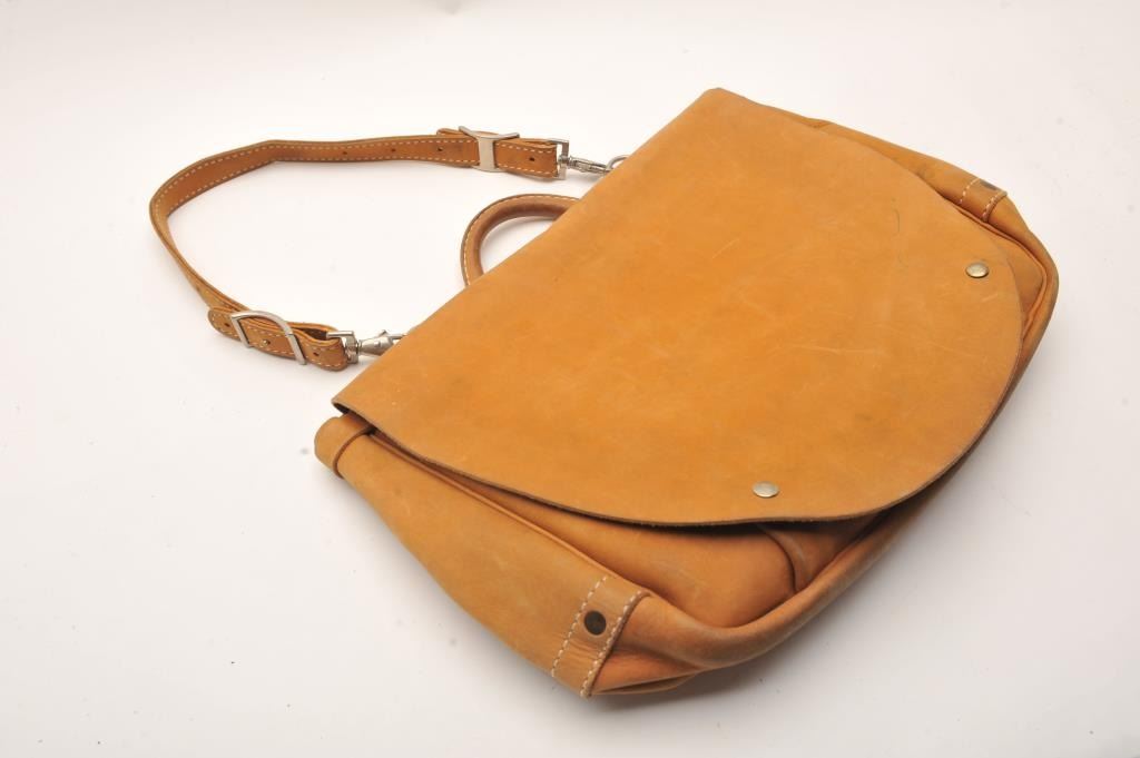 Suede leather attache case with fold over flap, tan in color, measuring approximaely 14"x 12"x 5", unmarked maker, well made, with single handle and shoulder strap. Zippered pocket under flap. Good to very good, with some use. Est. $40-80
