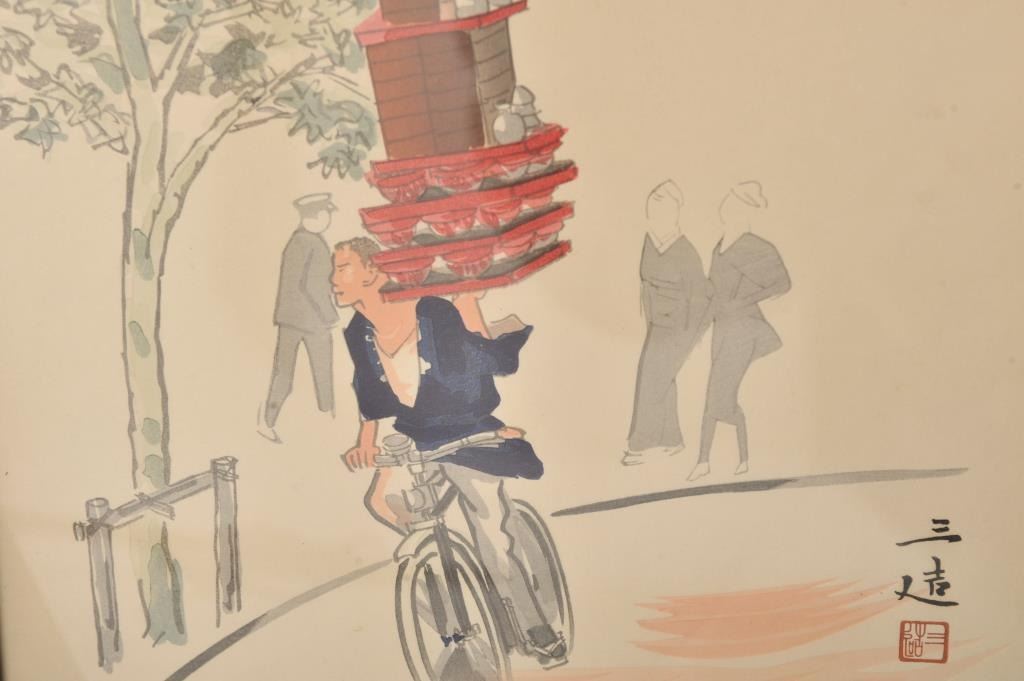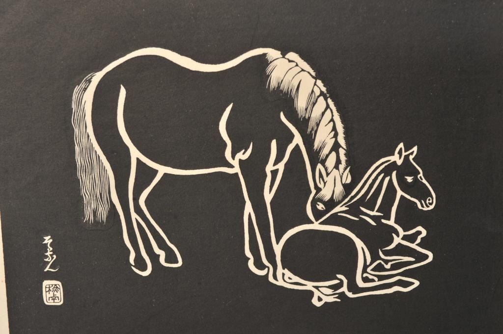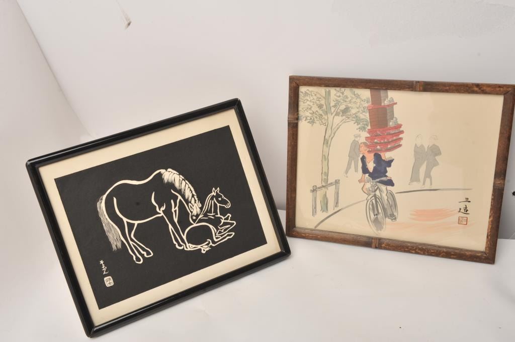 Japanese water color, 7 3/4" x 9 5/8" signed lower right; also black and white original artwork of two horses signed L.L., 6 3/8' x 9 3/4", collected by U.S. Army Officer Major Cable on duty 1955-1960 in Japan and thought to be pre WWII. Est. $100-200