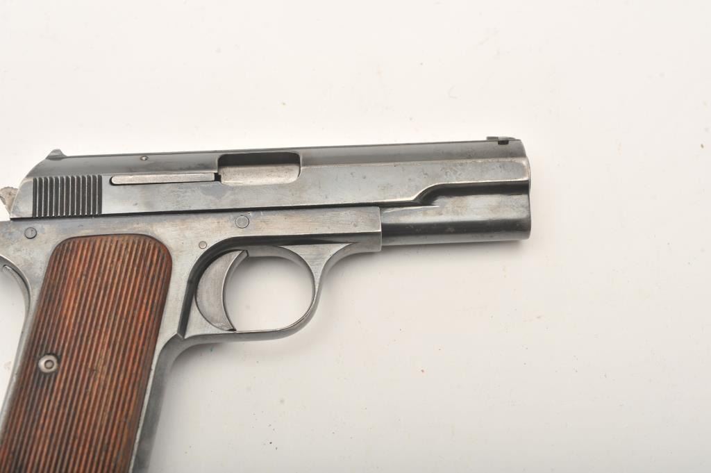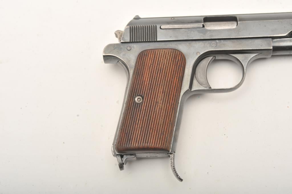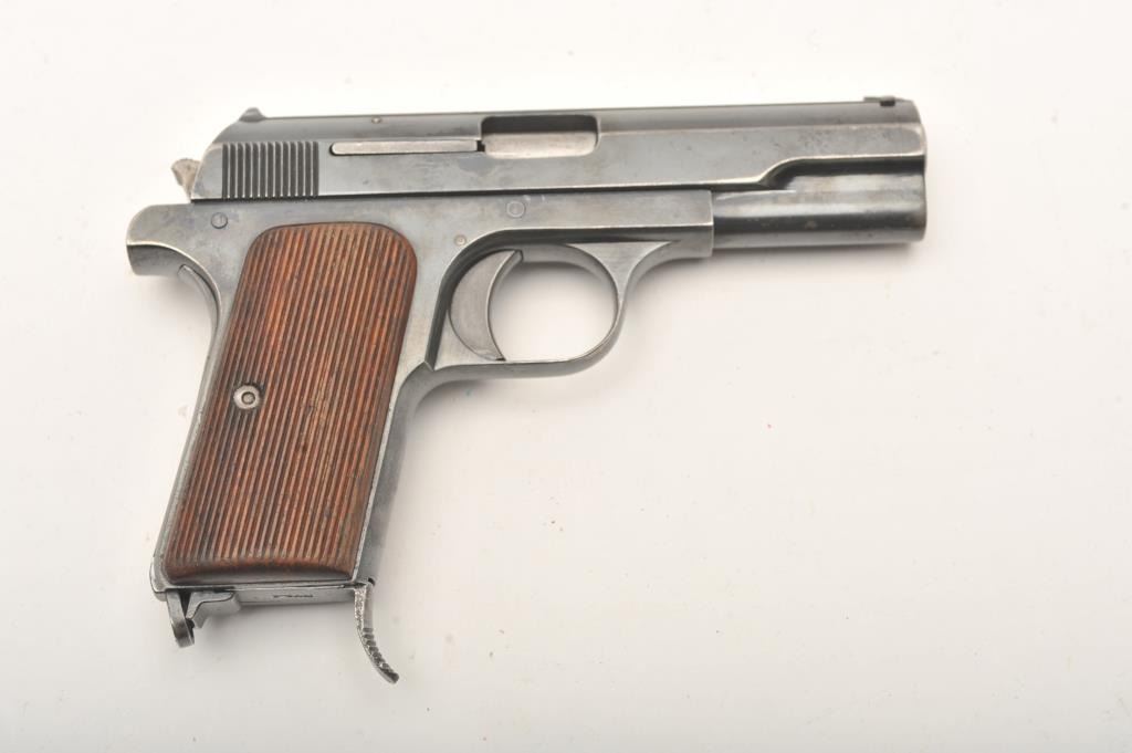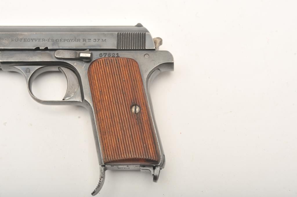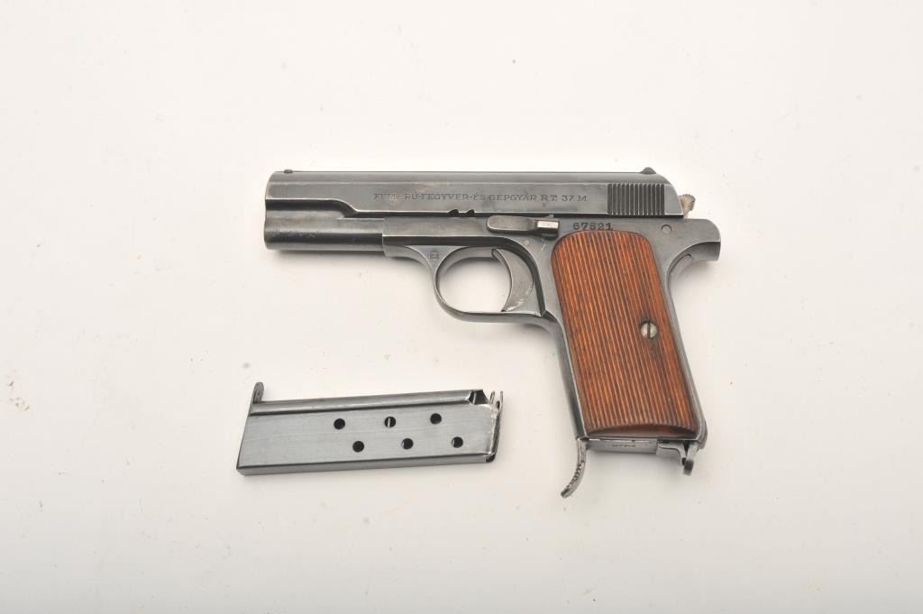 Femaru 37M semi-automatic pistol, .380 ACP caliber, Serial #67821. The pistol is in very good overall condition with a 4” barrel. Per the consignor, this is a Hungarian Police issue. The metal surfaces retain the majority of their blue finish with holster wear at the muzzle and high point edge wear. The ribbed wooden grips are in good condition showing mars and compressions from carry and use. The lot includes two correct magazines. The bore is good, the action is crisp and the markings are sharp. Est.: $250-$500. (C+R/PPT).