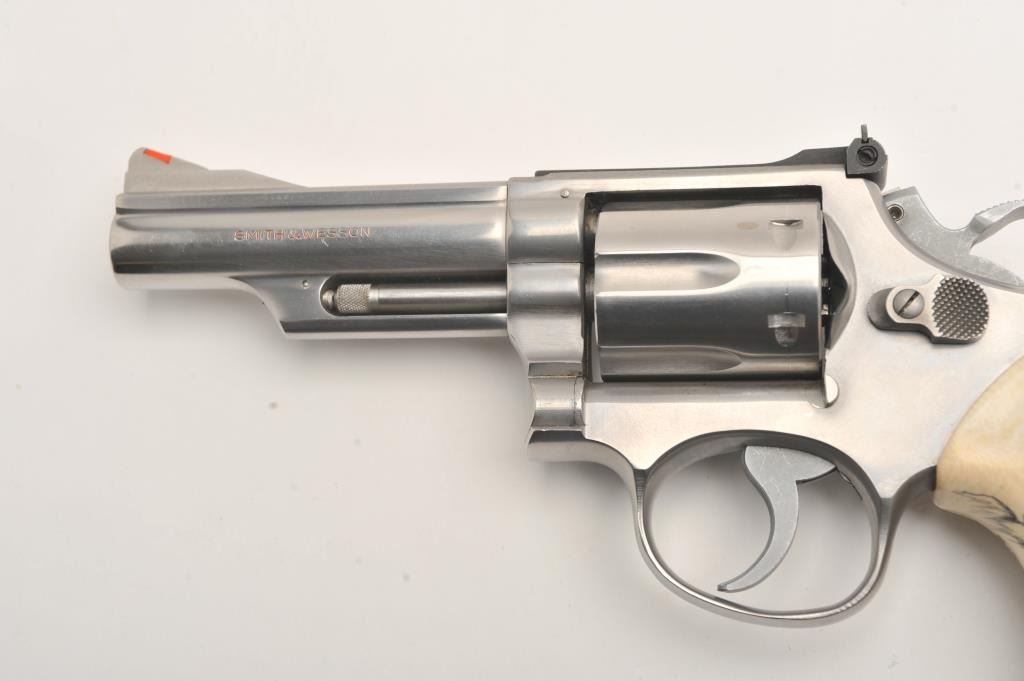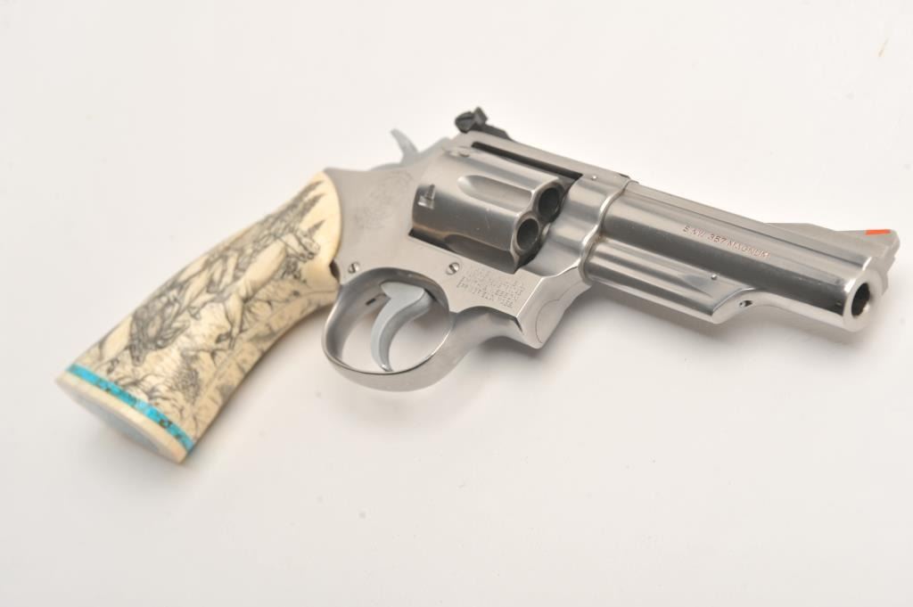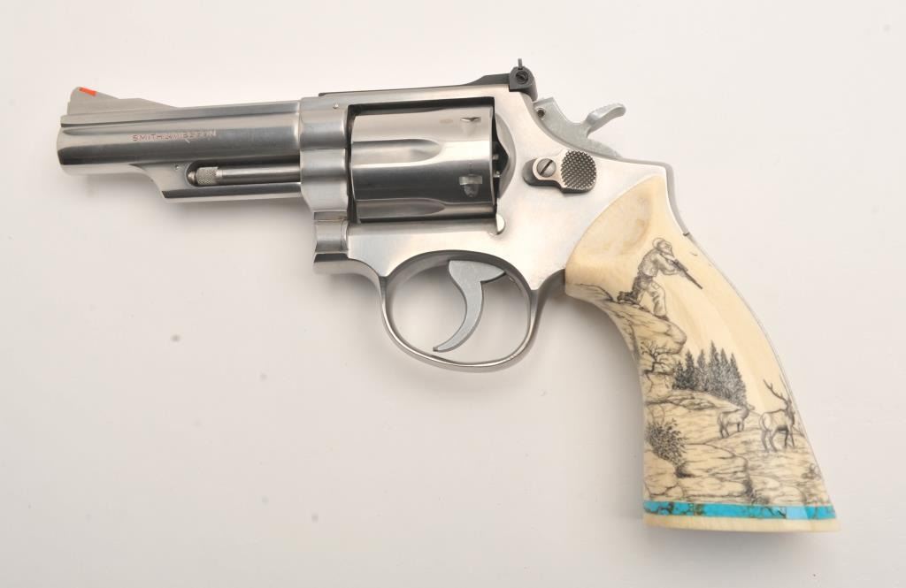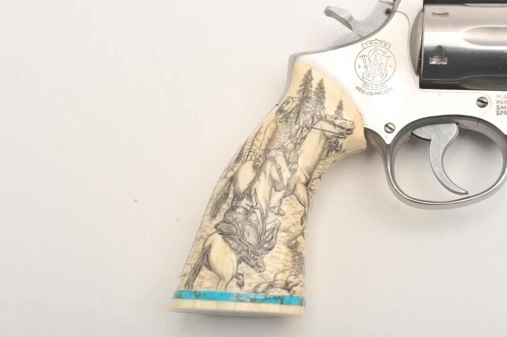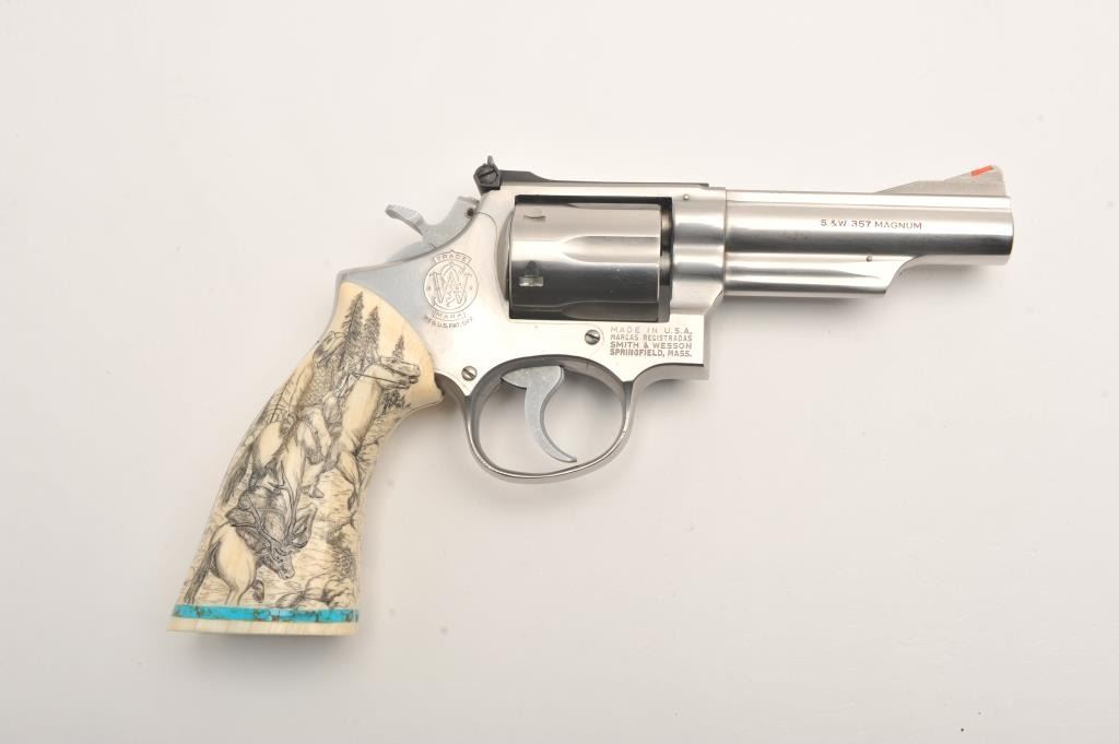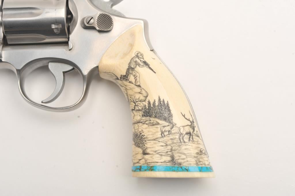 Smith & Wesson Model 66 revolver, .357 Magnum caliber, Serial #7K70688. The pistol is in very good overall condition featuring a 4â barrel with a ramped orange blade front and adjustable rear sights. The pistol retains the majority of its matte stainless steel finish with handling marks and a faint drag line on the cylinder noted. The grips are beautiful smooth marine ivory with a scrimshawed game scene, inlayed with Turquoise and signed, âWC SCHOTTS 80 No. 1 IN 1980â. The bore is good, the action is crisp and markings are sharp. Est.: $600-$1,200. (Modern/PPT).