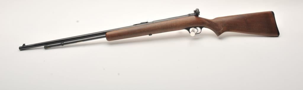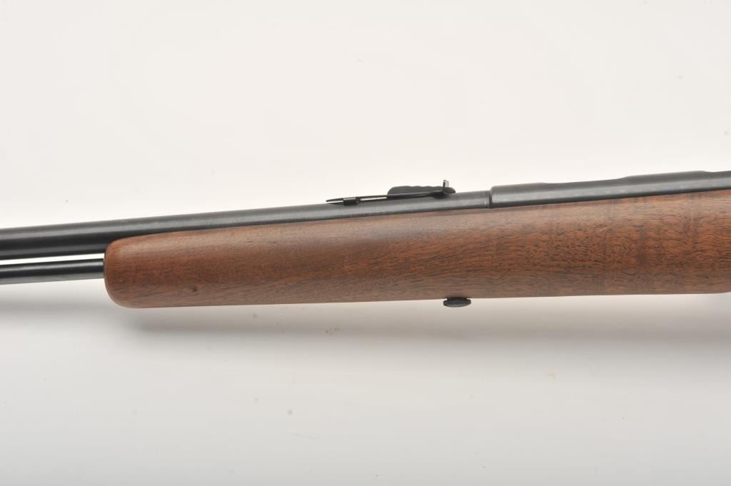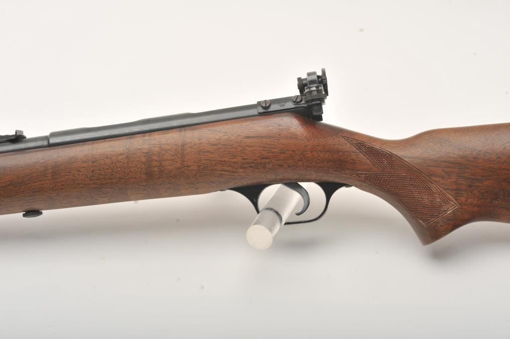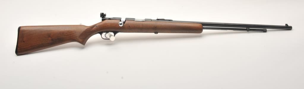 Savage Model 5 bolt action rifle, .22 Short, Long or Long Rifle caliber, Serial #NSNV. The rifle is in very good to nearly fine overall condition with a 23” barrel. The metal surfaces retain nearly all of their blue finish with only light handling and storage marks. The checkered wood stocks are in very good condition showing little wear or use. A period aperture sight has been added at the tang during the period of use. The bore is good, the action is crisp and the markings are sharp. Est.: $150-$300. (C+R).